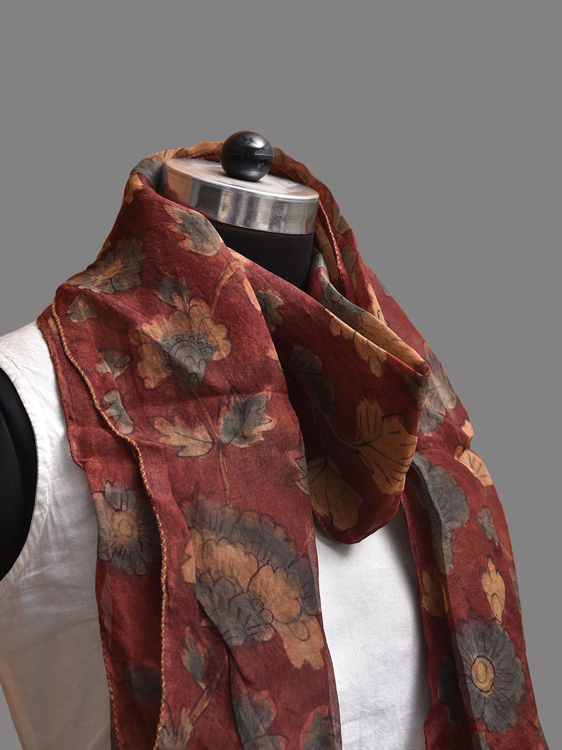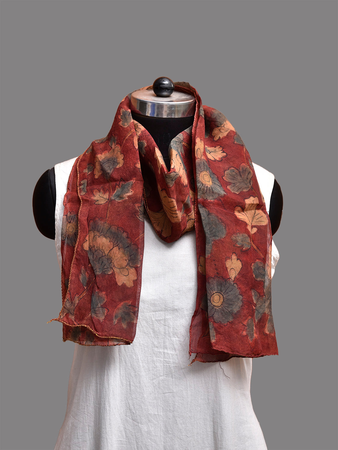 Red Kalamkari Hand Painted Organza Stole with Floral Design. This hand painted kalamkari is done using natural dyes. As they are natural colors they bleed with initial washes, so we suggest Dry clean.