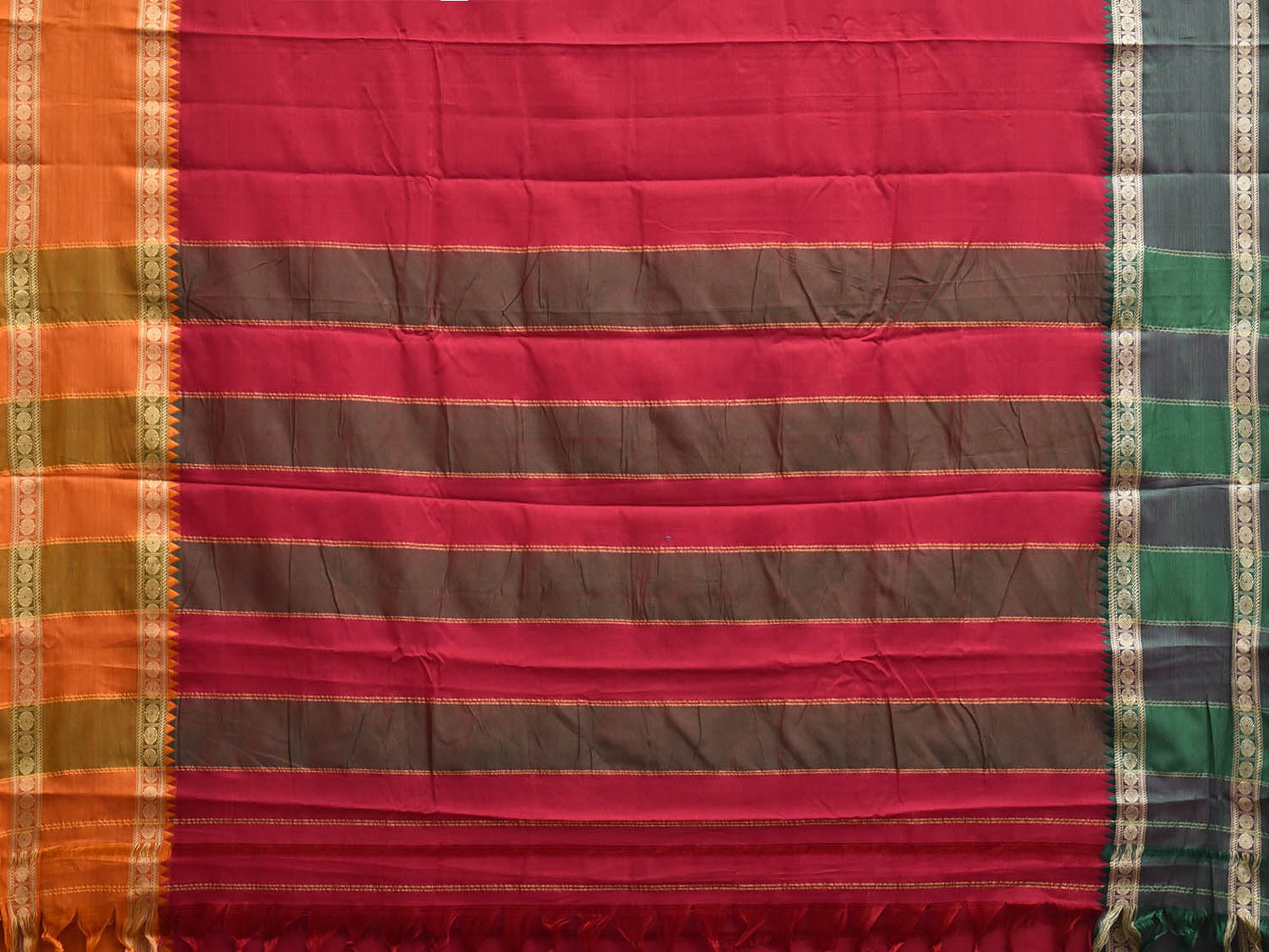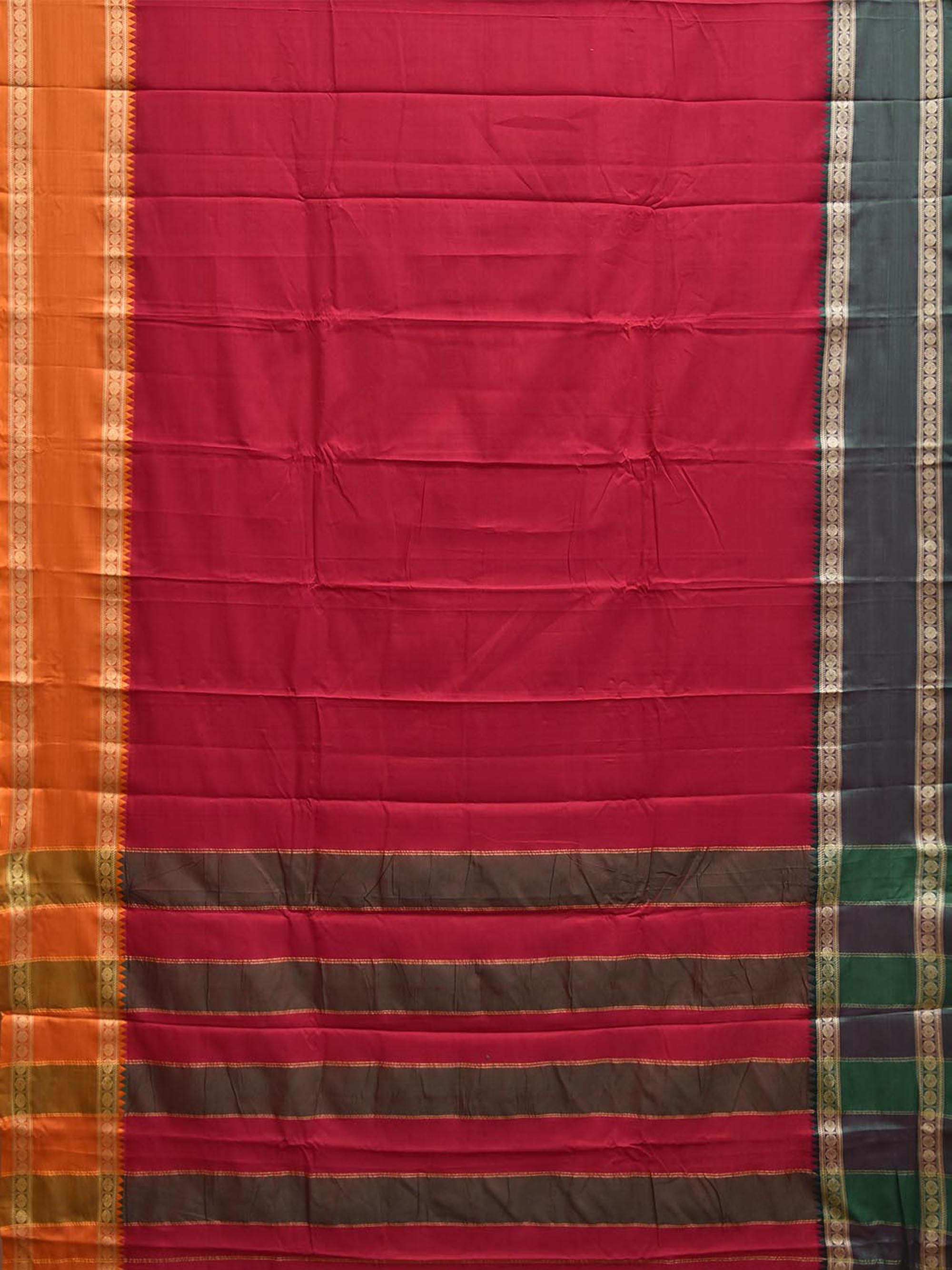 Red Kanchipuram Cotton Plain Saree with Ganga-Jamuna Border Design No Blouse. Traditional Simple South Indian Attire Saree for any Casual Occasions. As it’s a cotton saree we advice gentle handwash separately for fabric care. This saree has no blouse.