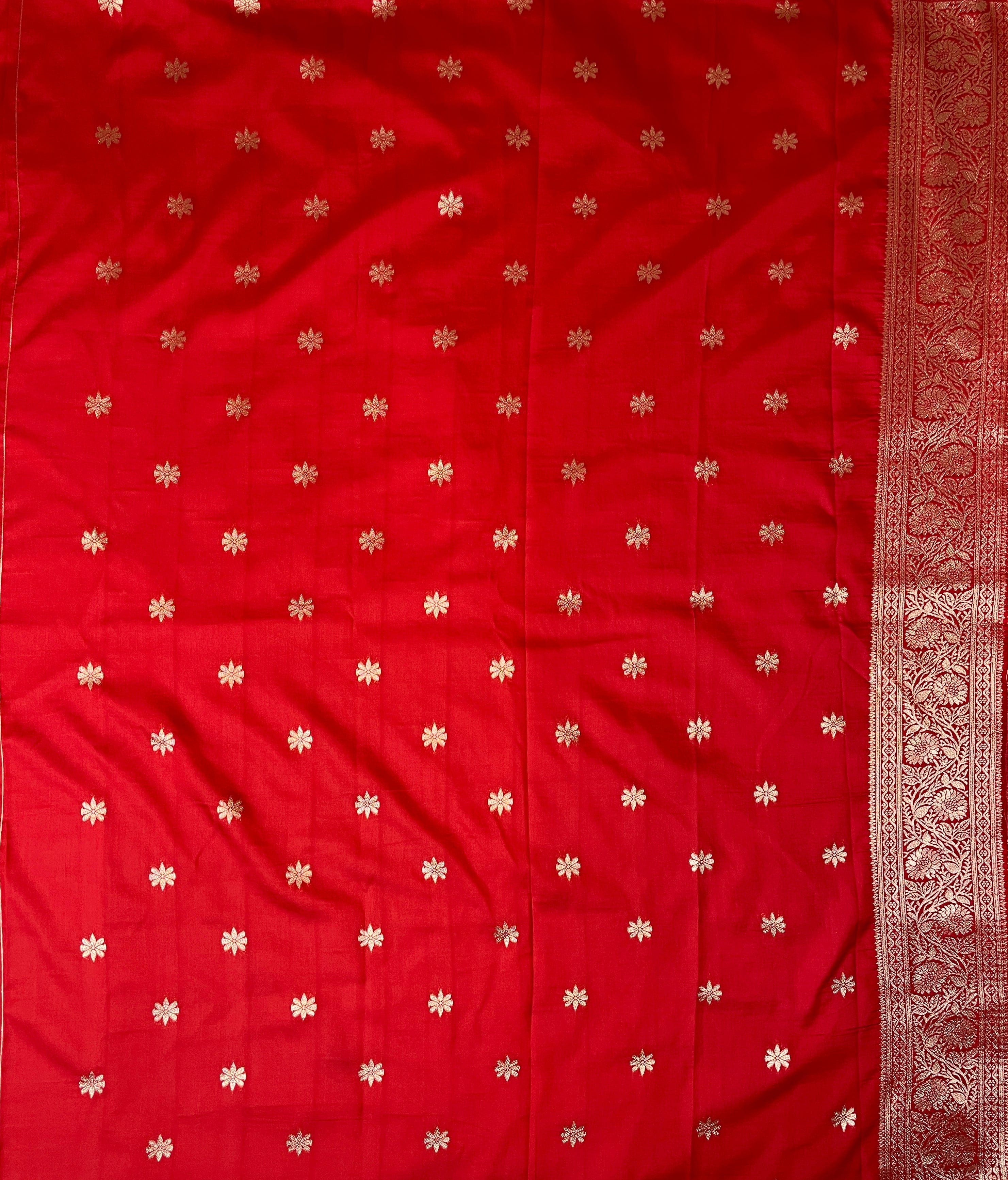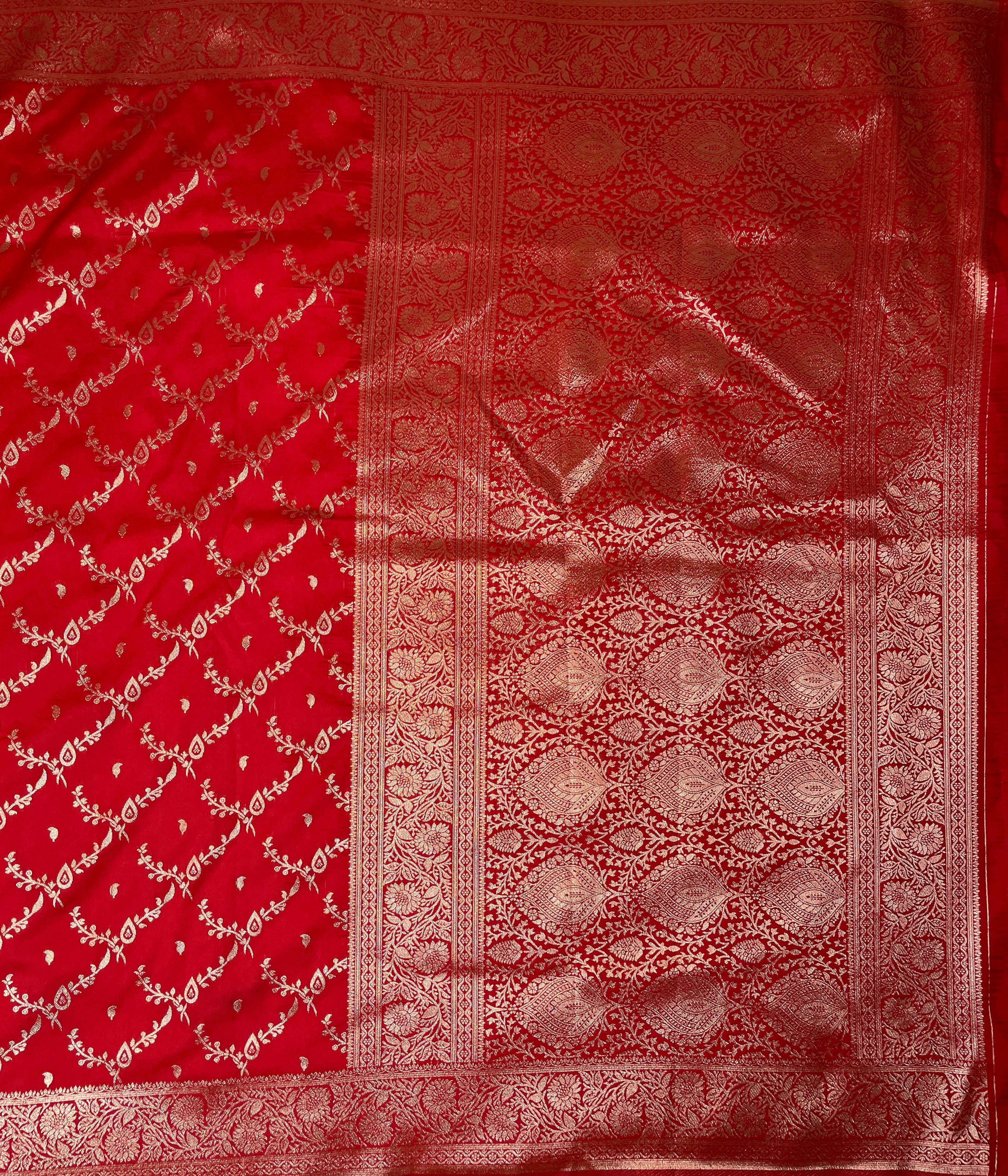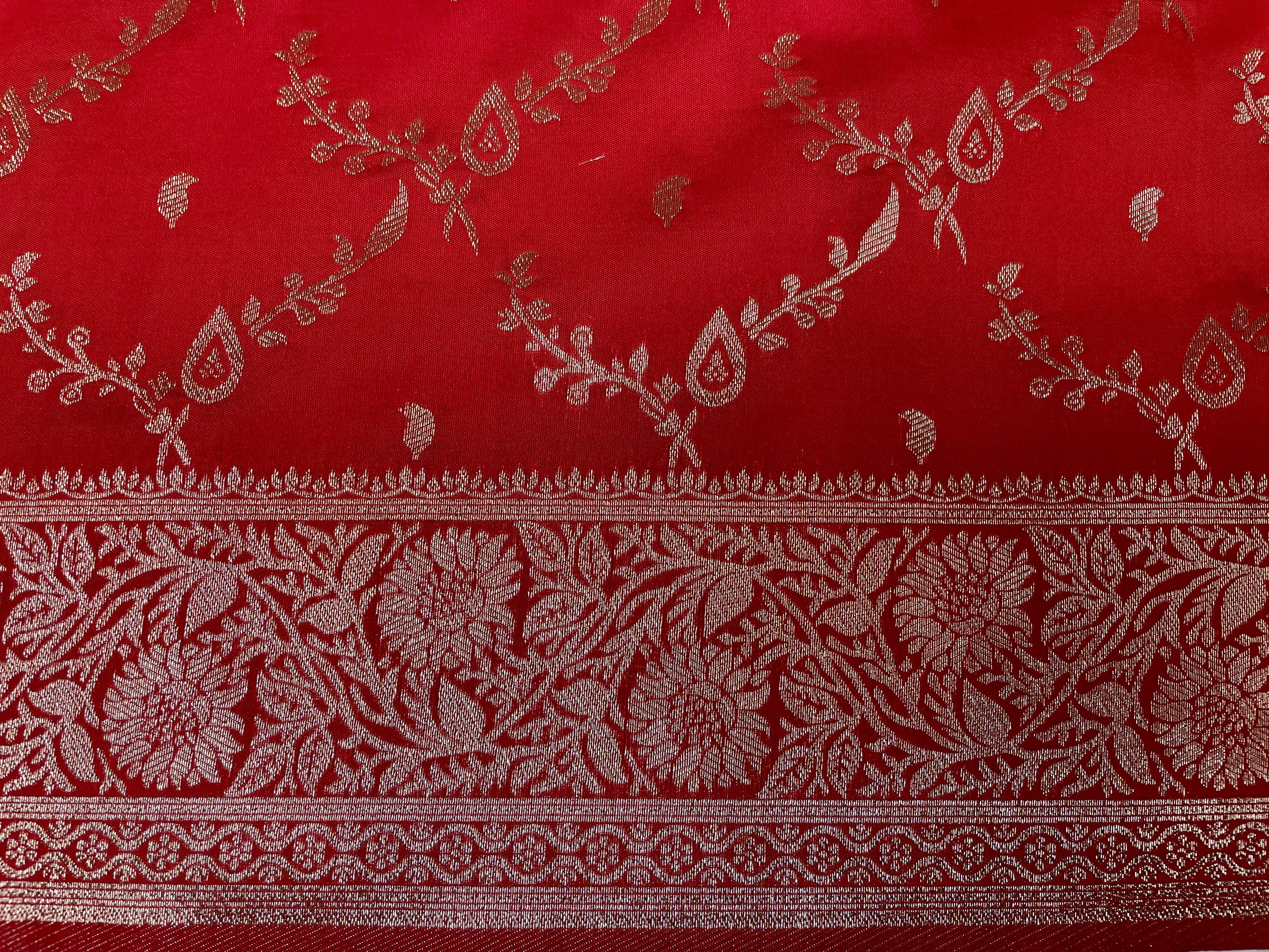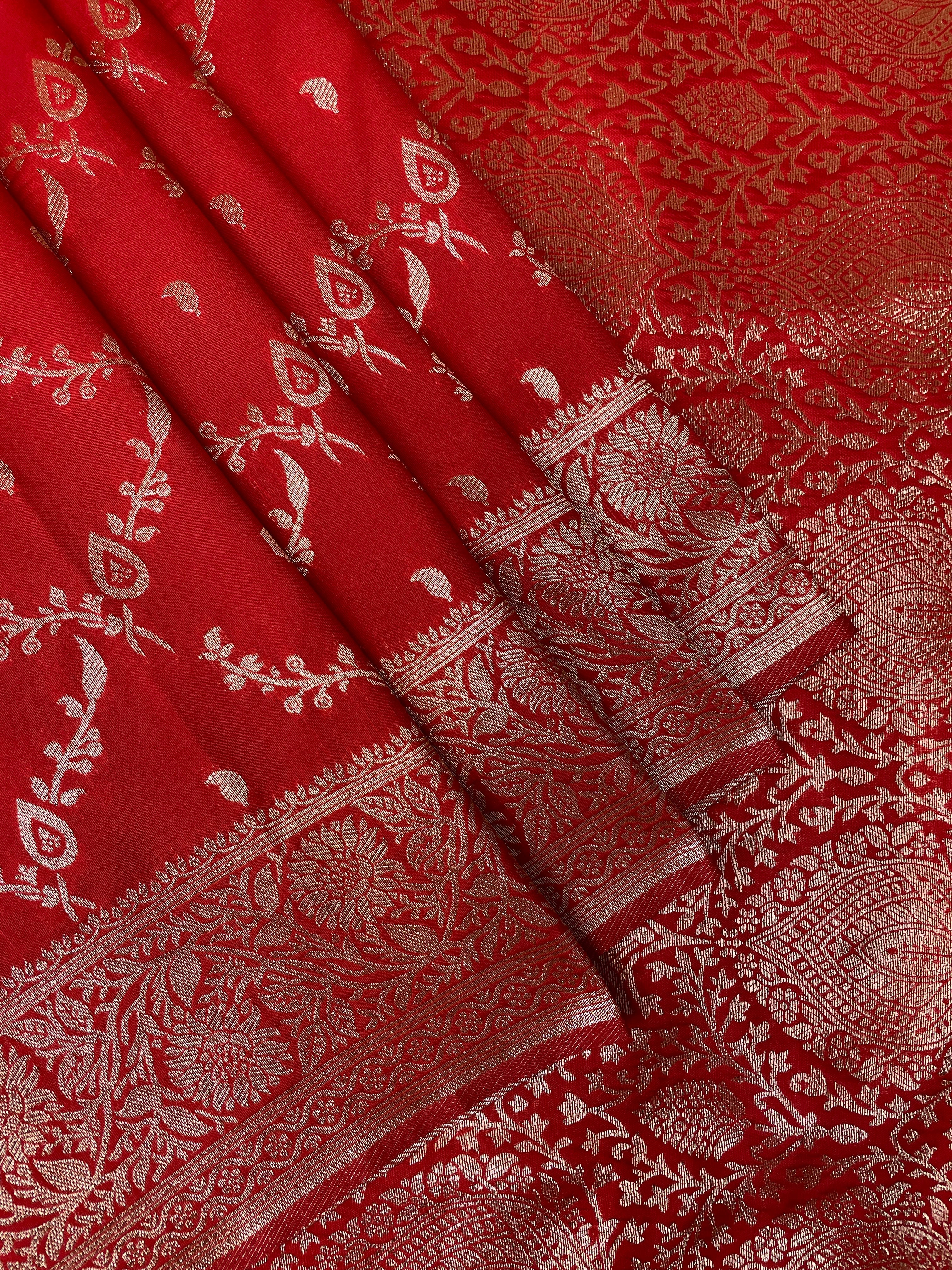Red Banaras Viscose Katan Saree with Silver Zari Floral Weaving And Grand Pallu B0549ds