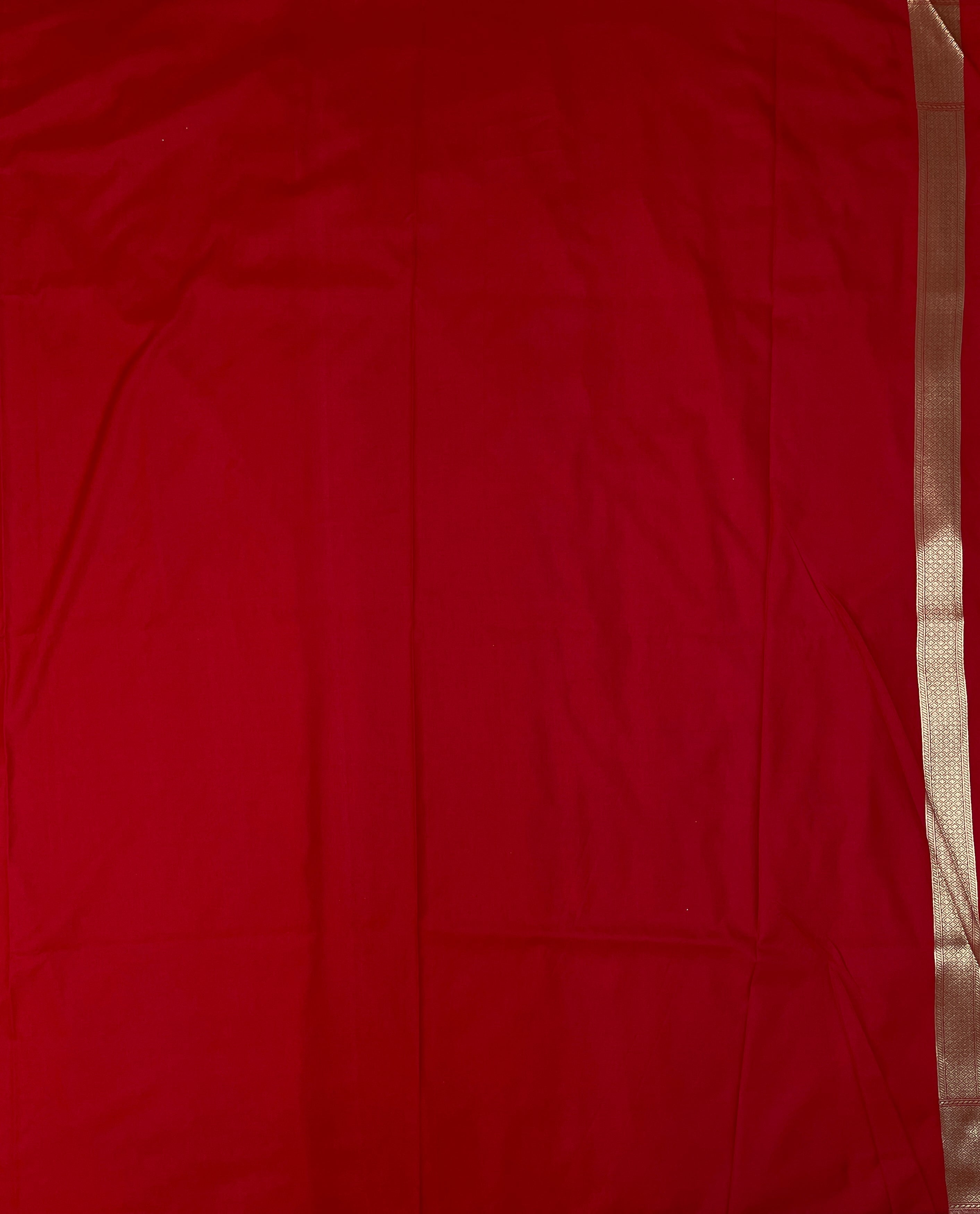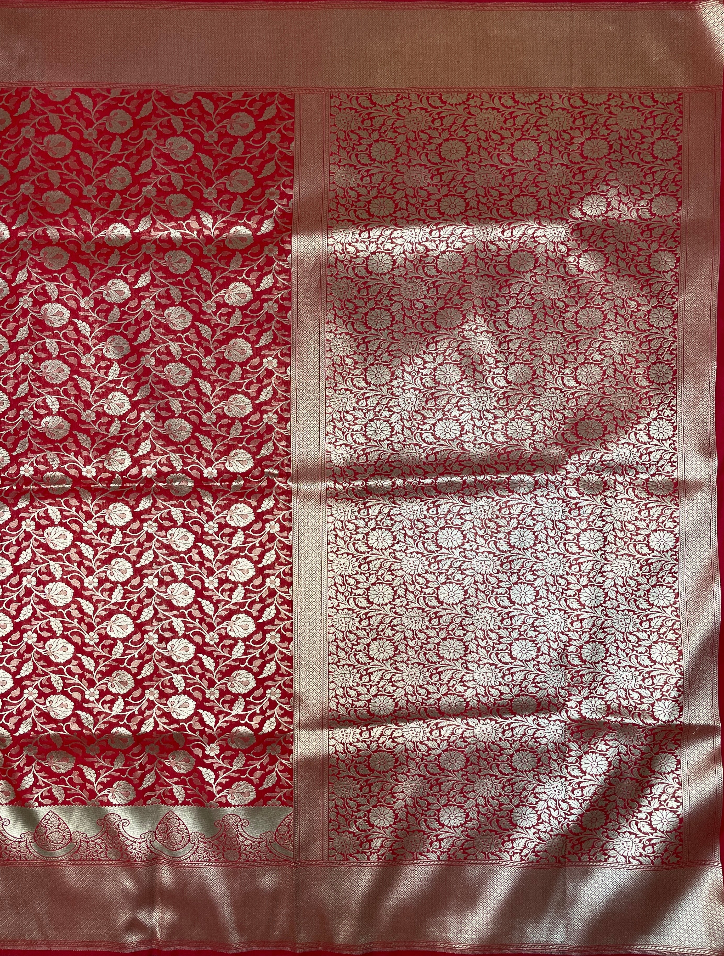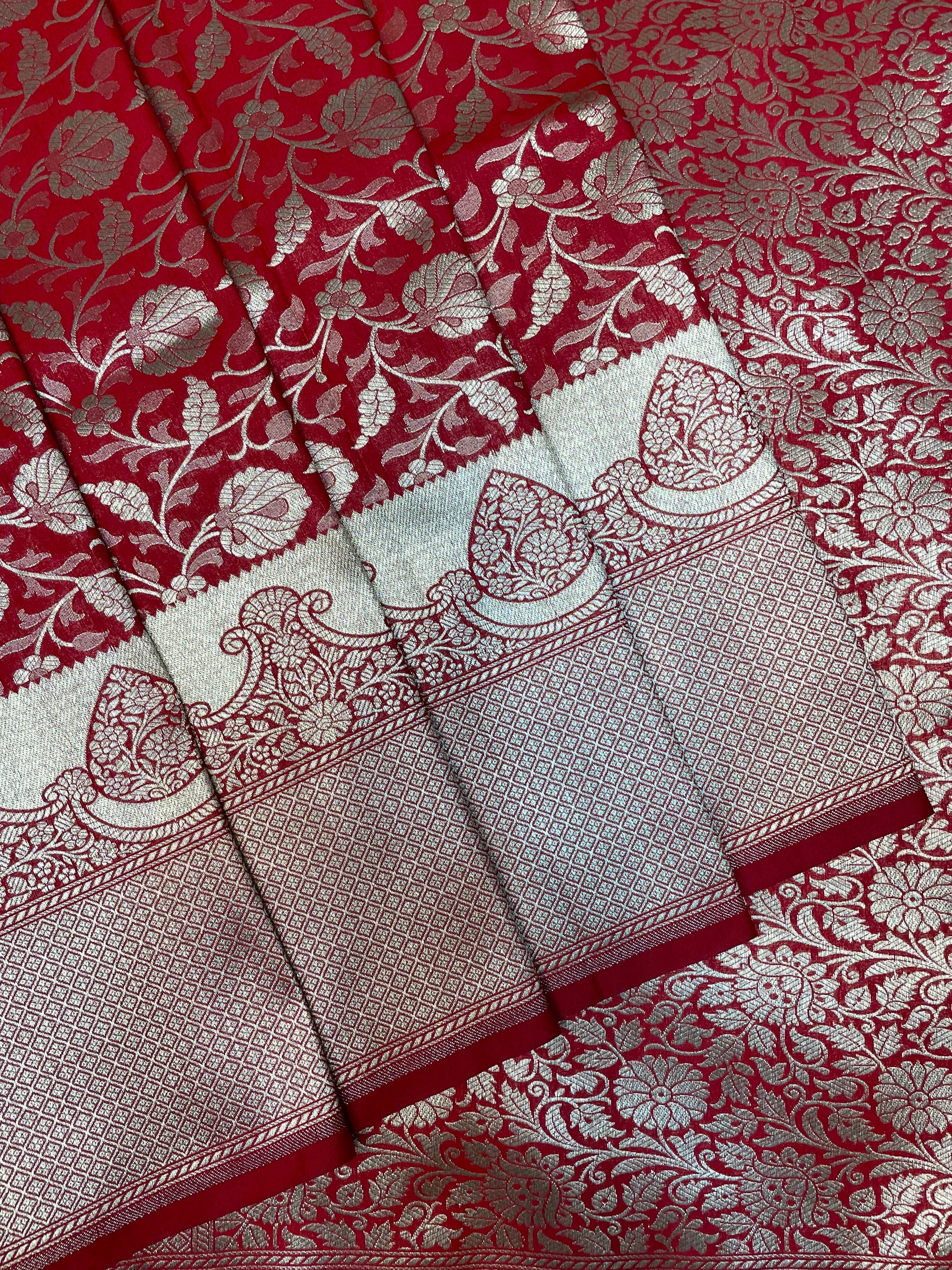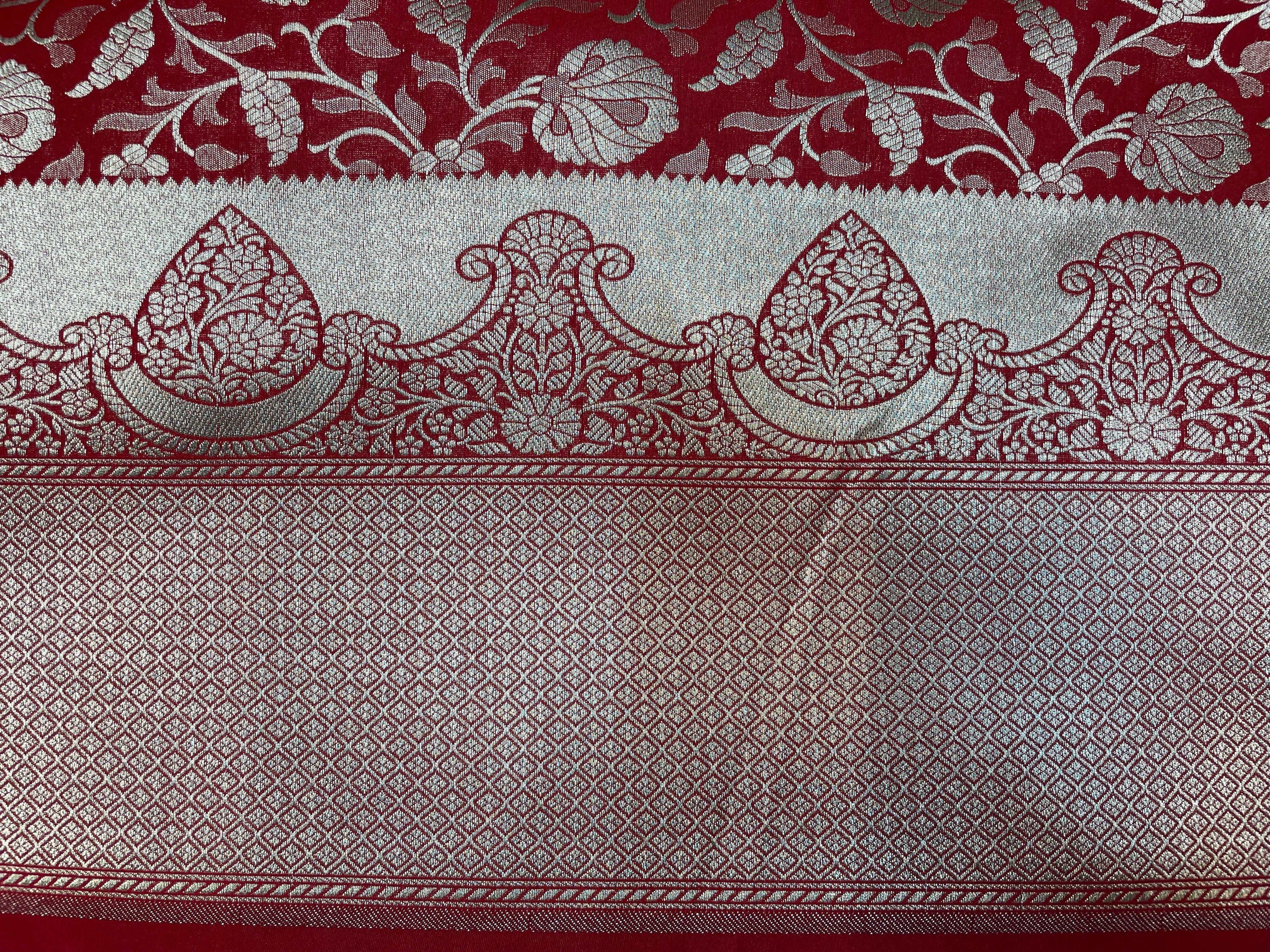 Red Katan Banarasi Saree with Silver Zari Floral Weaving And Grand Pallu B0600ds