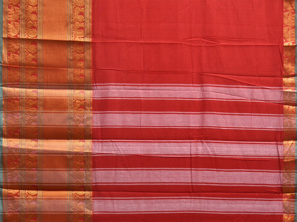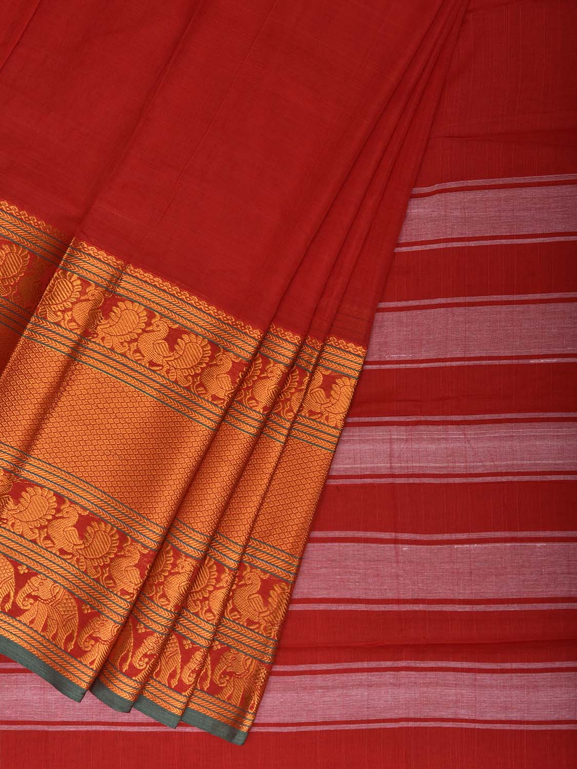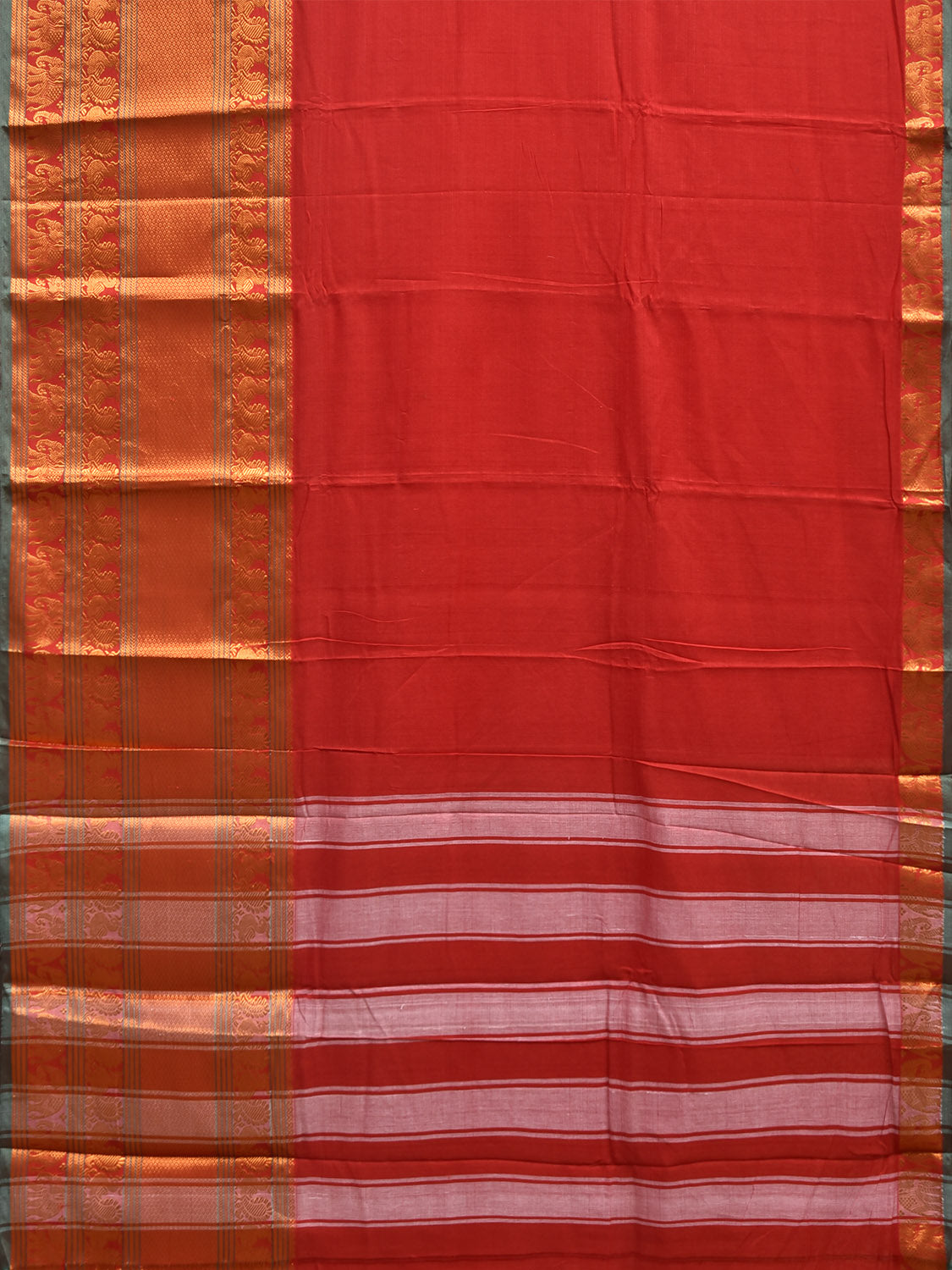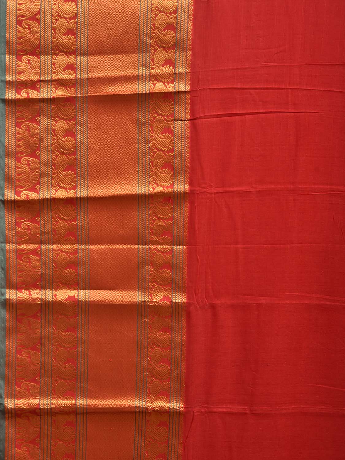 Red Madurai Cotton Plain Saree with Kanchipuram Border Design No Blouse. Traditional Simple South Indian Attire Saree for any Casual Occasions. As it’s a cotton saree we advice gentle handwash separately for fabric care. This saree has no blouse.