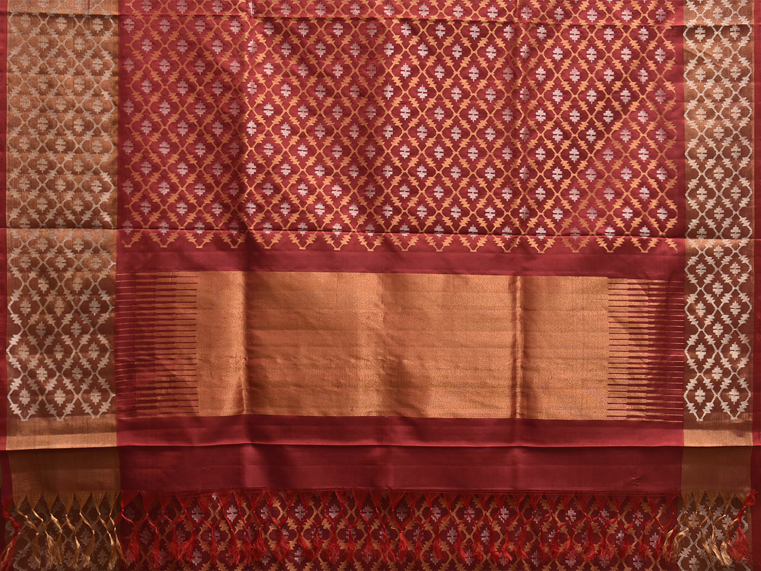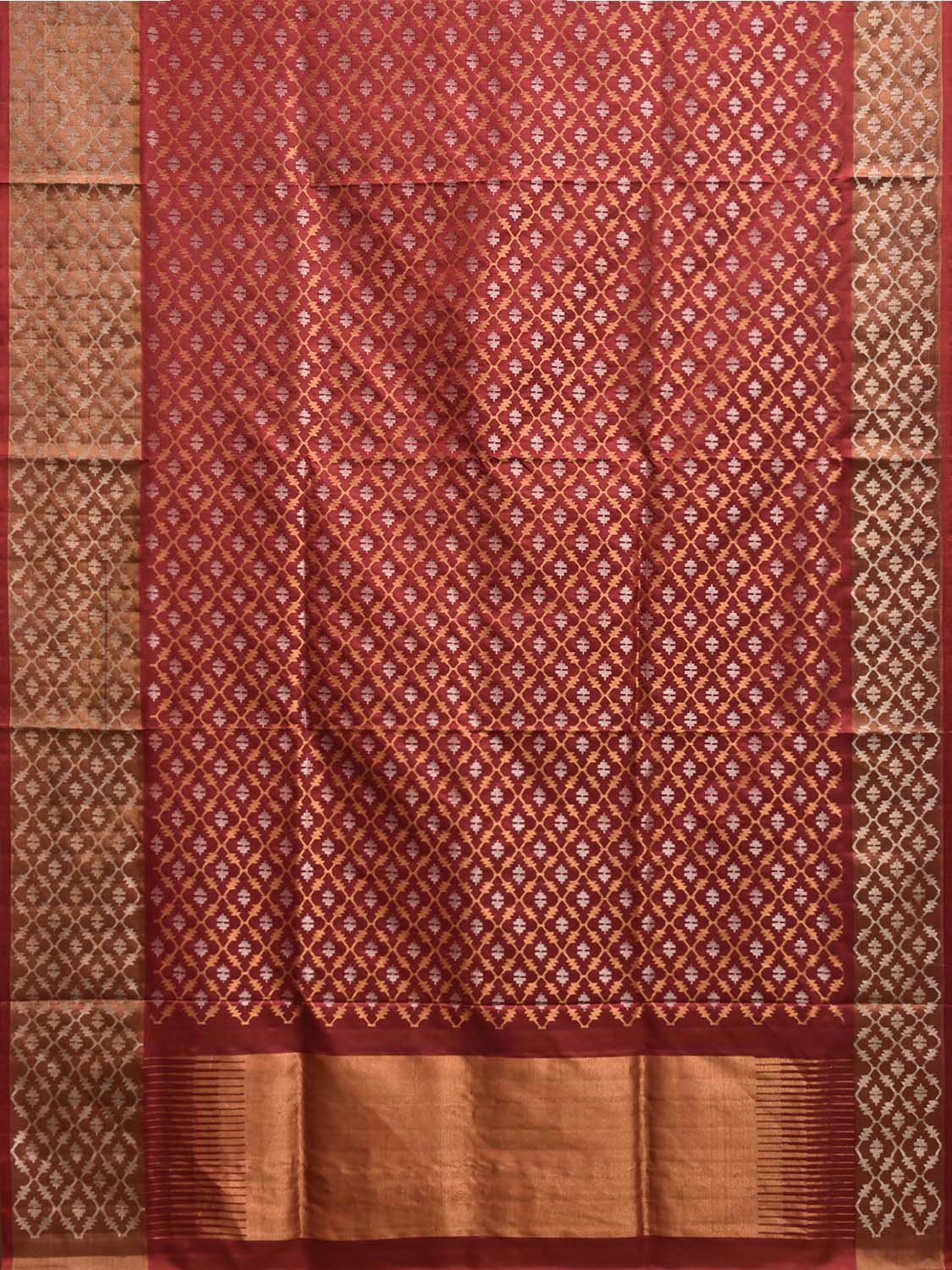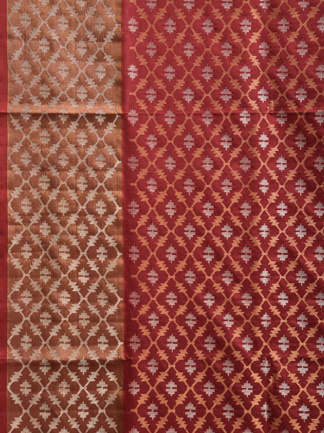 Shimmering Diamond Body: The silk body beautifully echoes the border's theme, with small Dhakai diamond motifs scattered all over, each woven with the combined shimmer of gold and silver zari.
