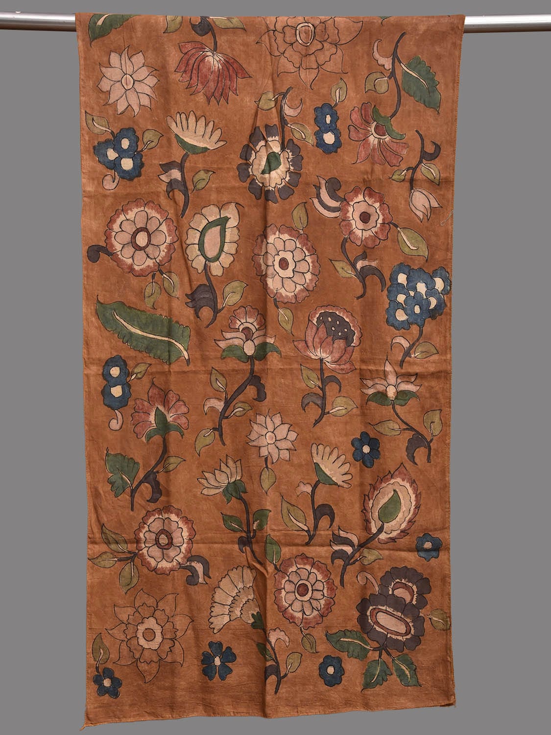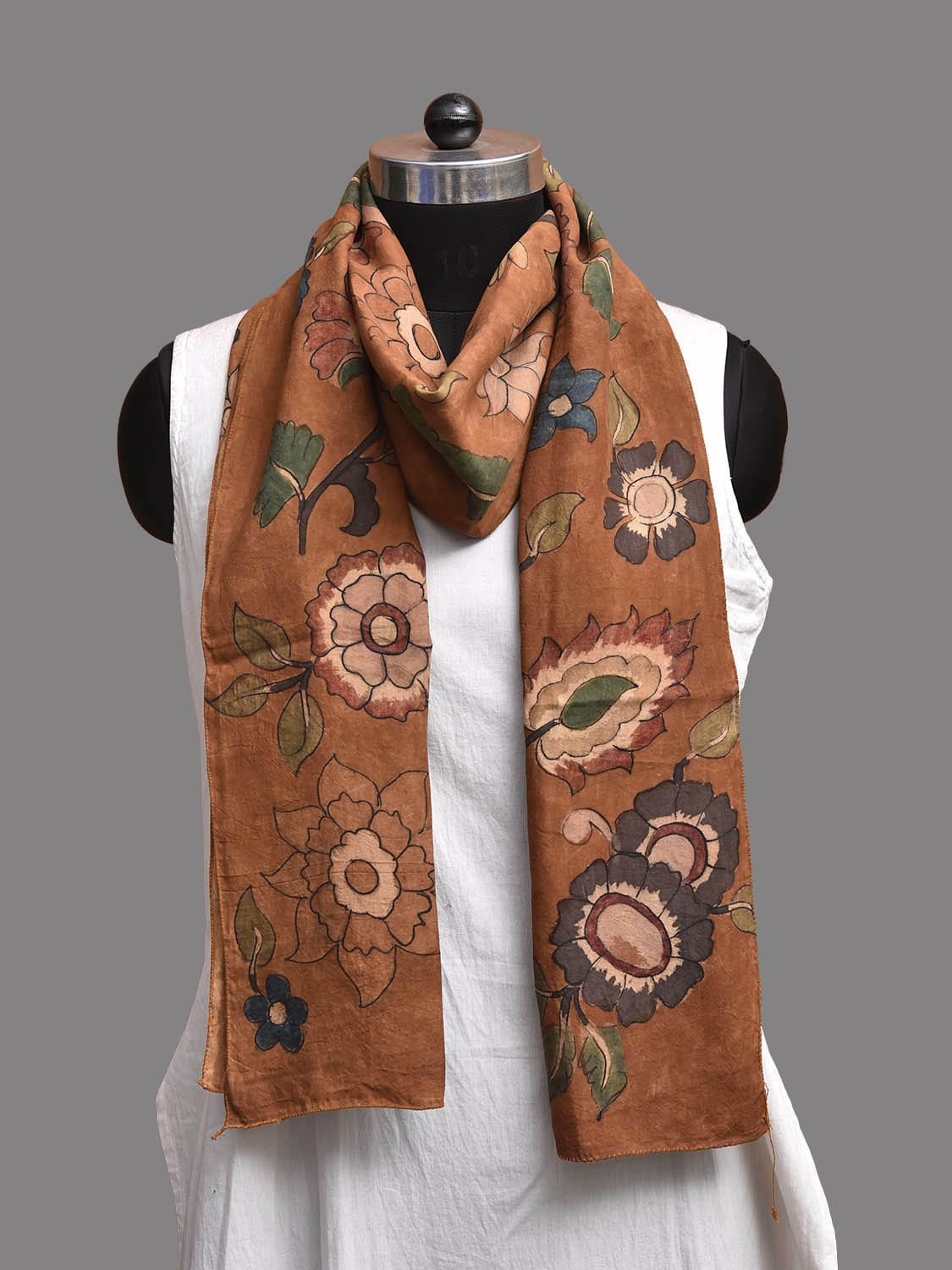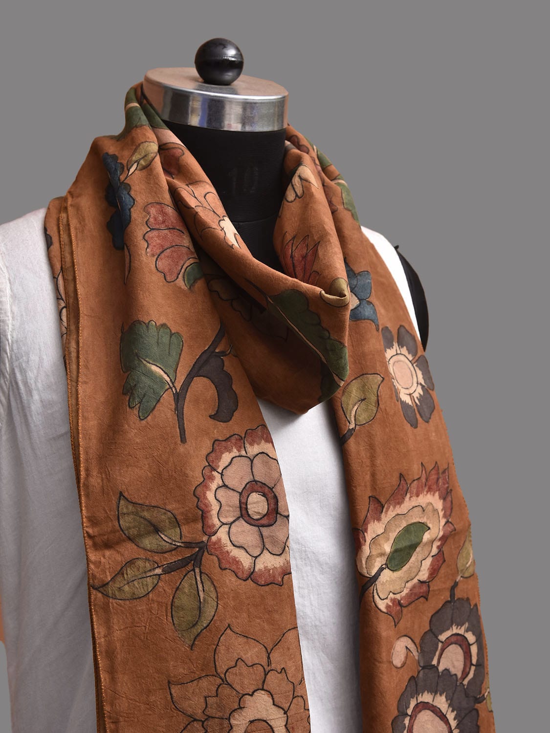 Rust Kalamkari Hand Painted Sico Stole with Floral Design. This hand painted kalamkari is done using natural dyes. As they are natural colors they bleed with initial washes, so we suggest Dry clean.