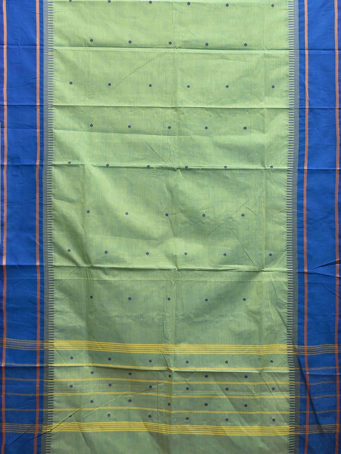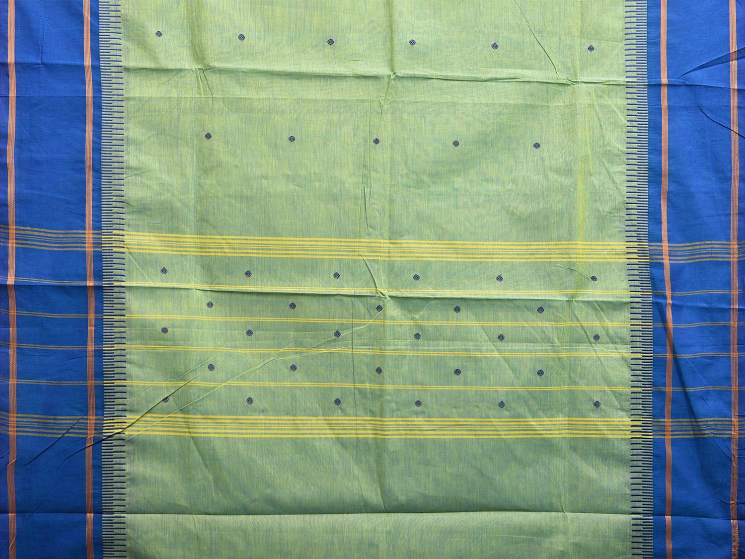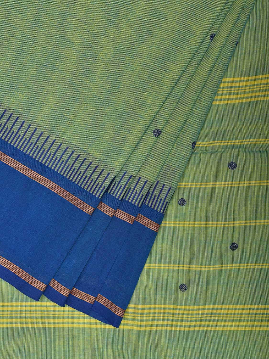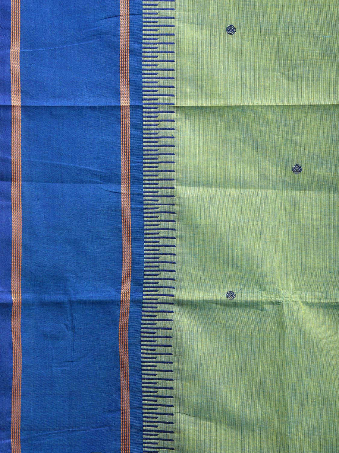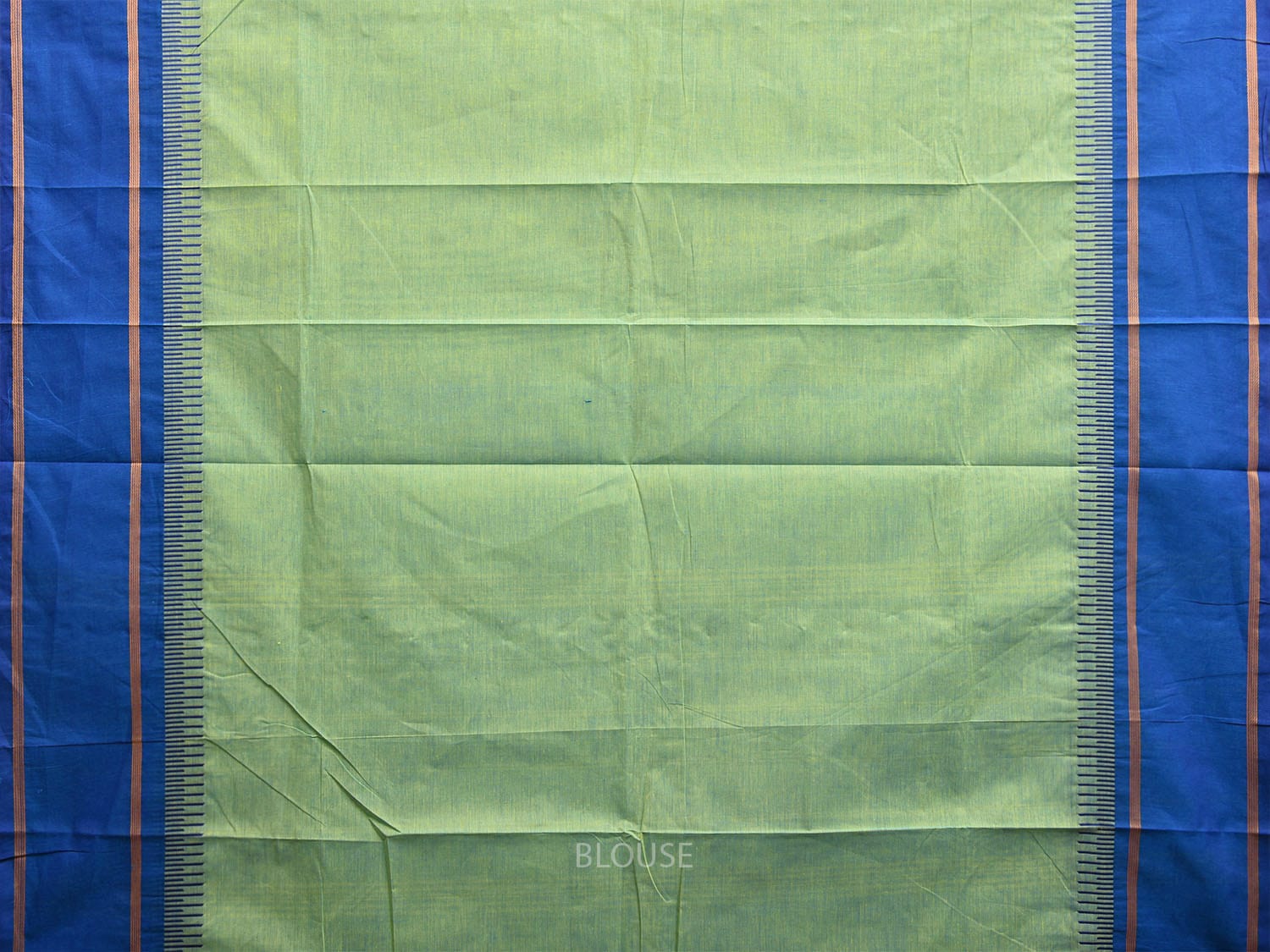 Sea Green and Blue Kanchipuram Cotton Saree with Strips Pallu Design. Traditional Simple South Indian Attire Saree for any Casual Occasions. As it’s a cotton saree we advice gentle handwash separately for fabric care.