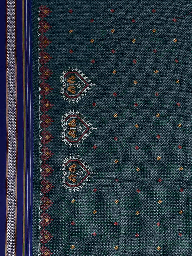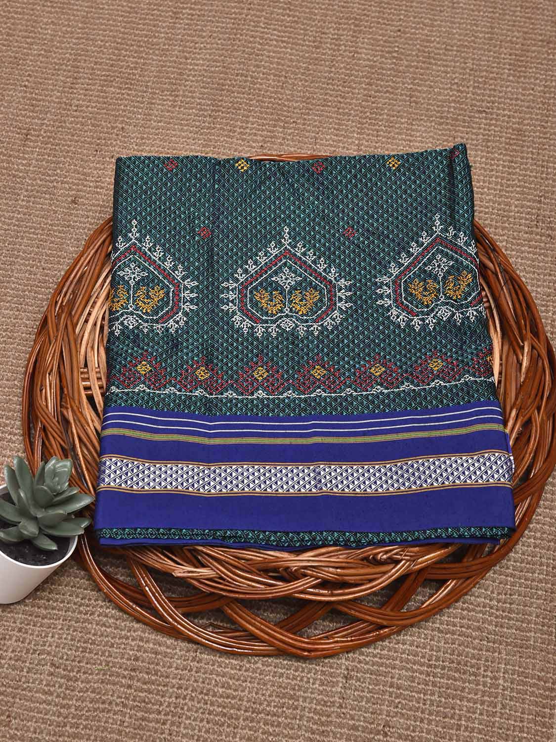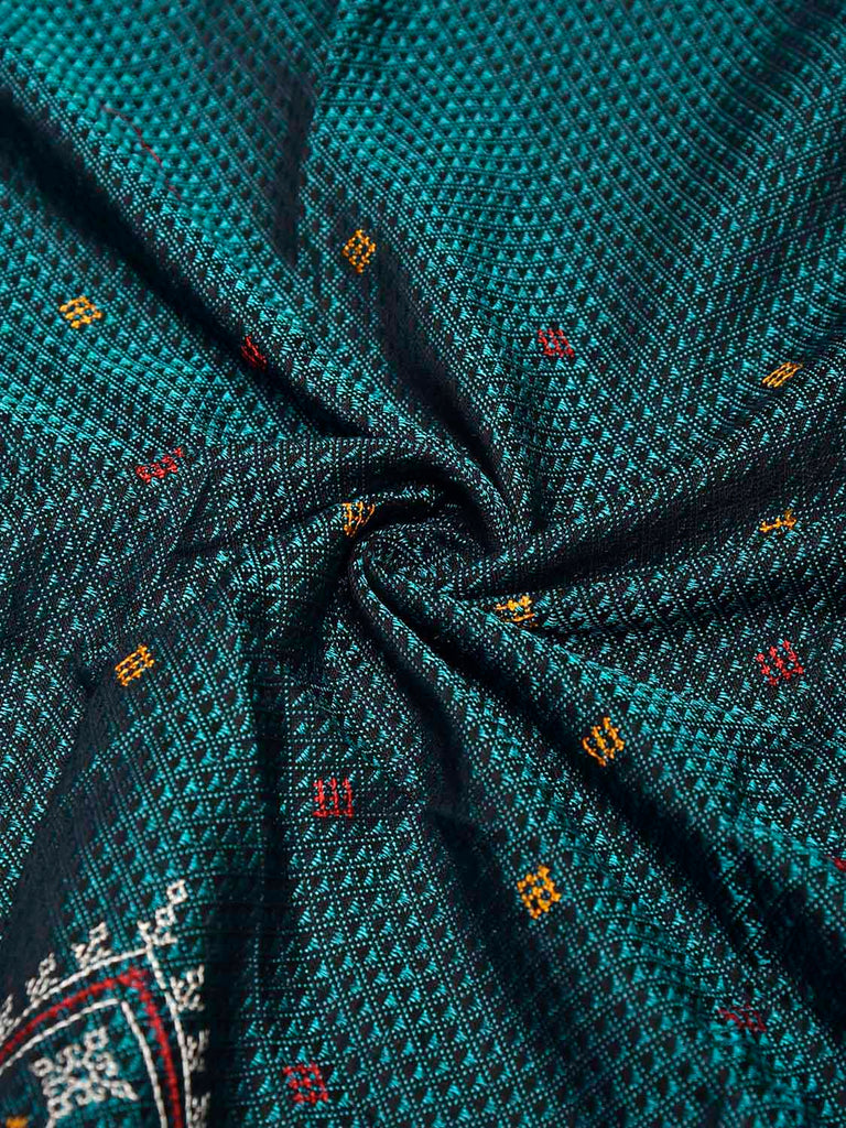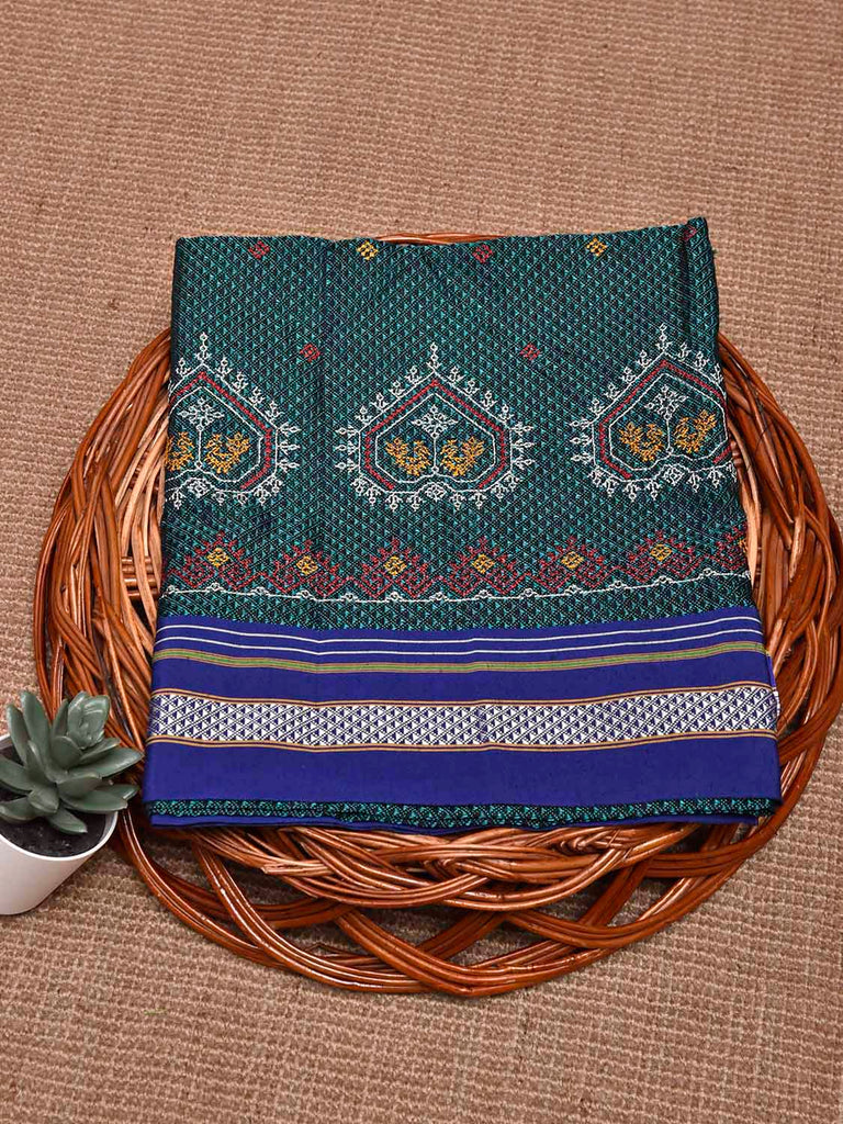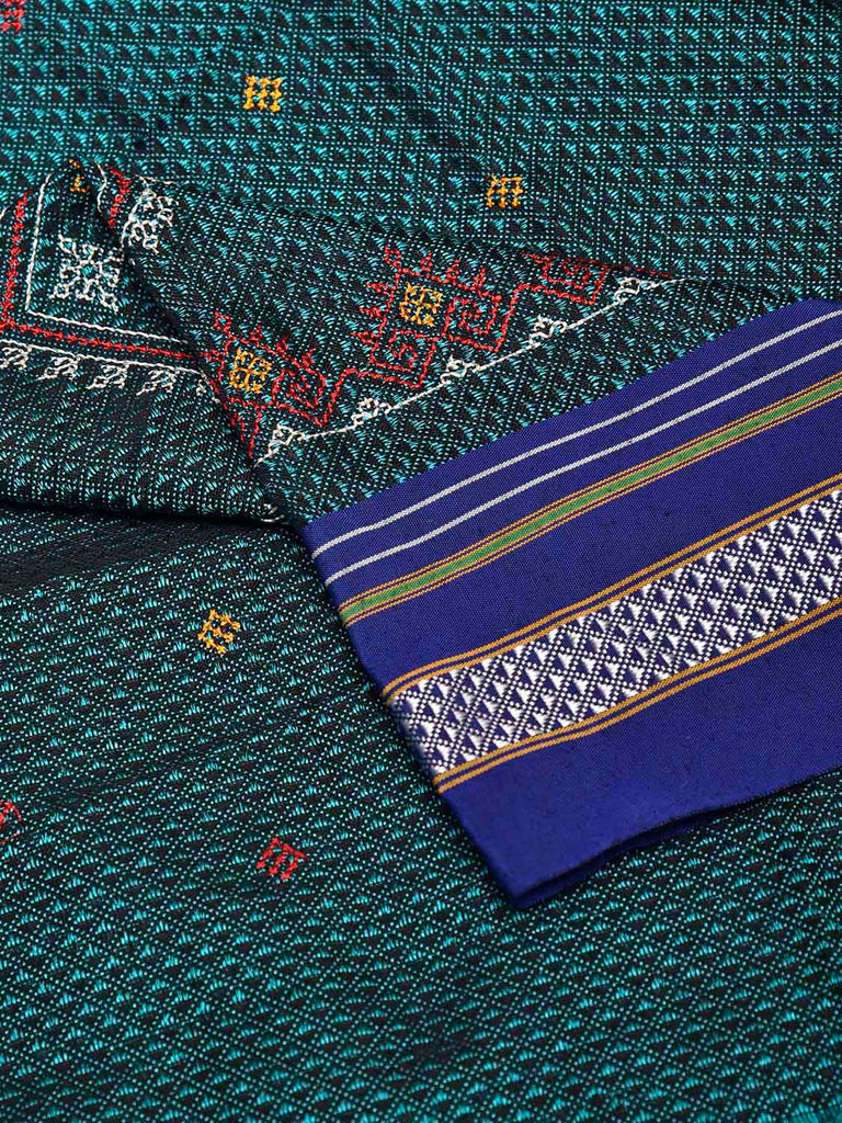 Teal and Blue Kasuti Viscose Blouse with Peacock Design Length 1mt Width 44 Inches. Beautiful Pattern Blouse Fabric and Easy to Match to Any Suitable Saree. We Advise Gentle Handwash for Fabric Care.