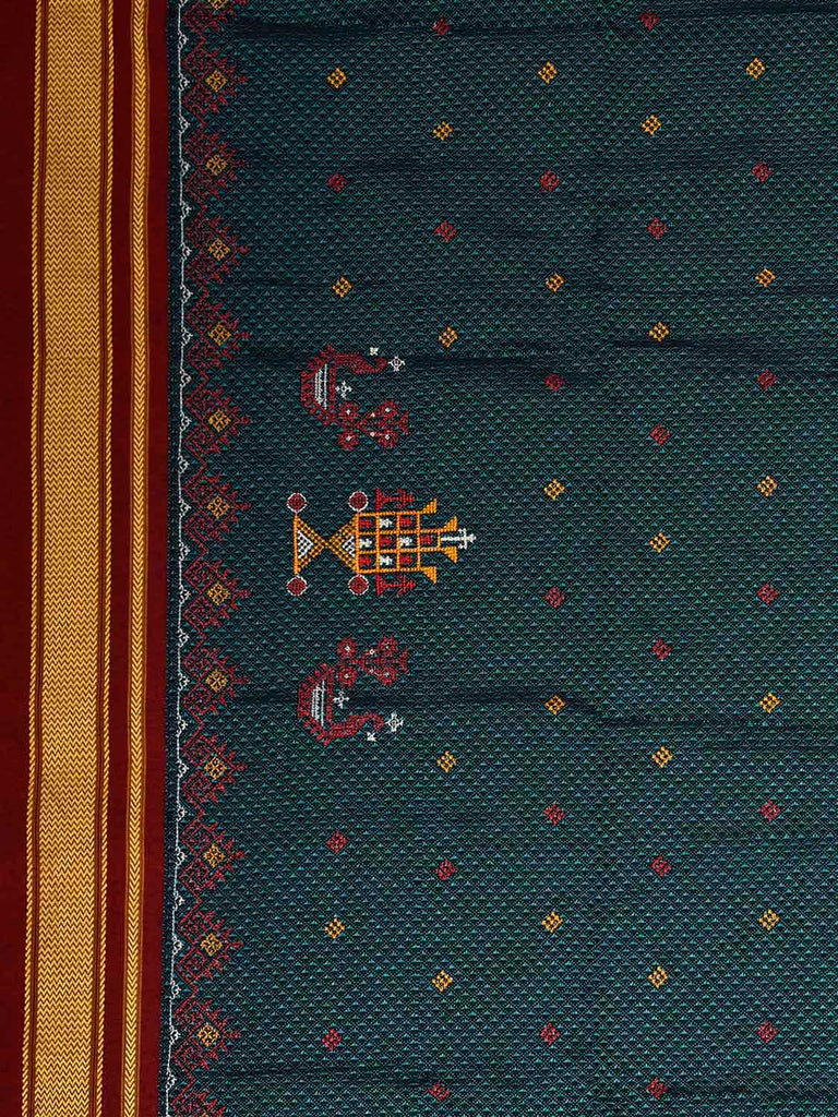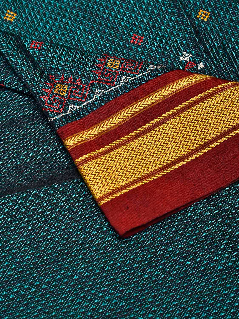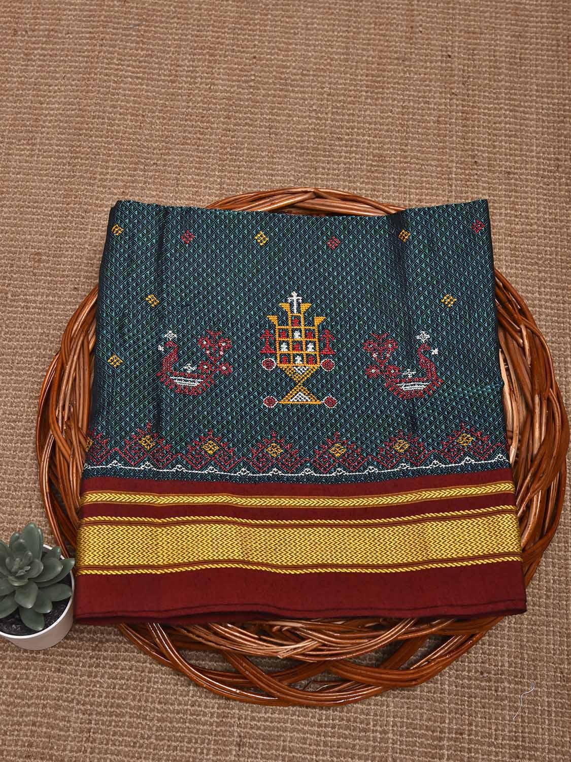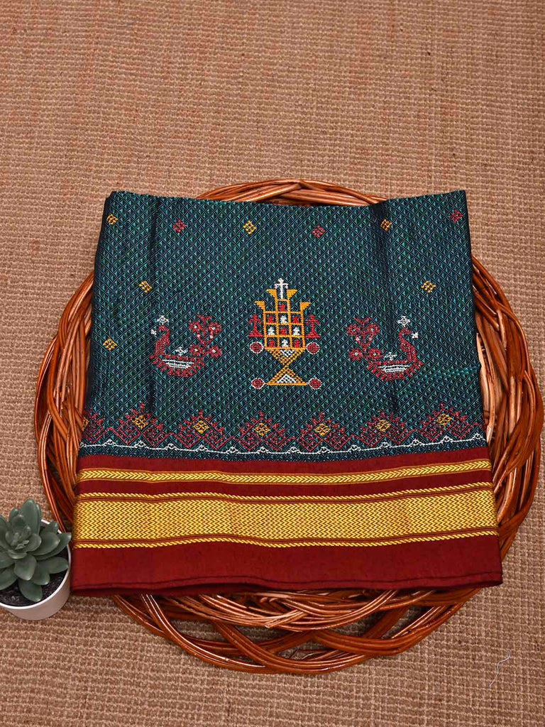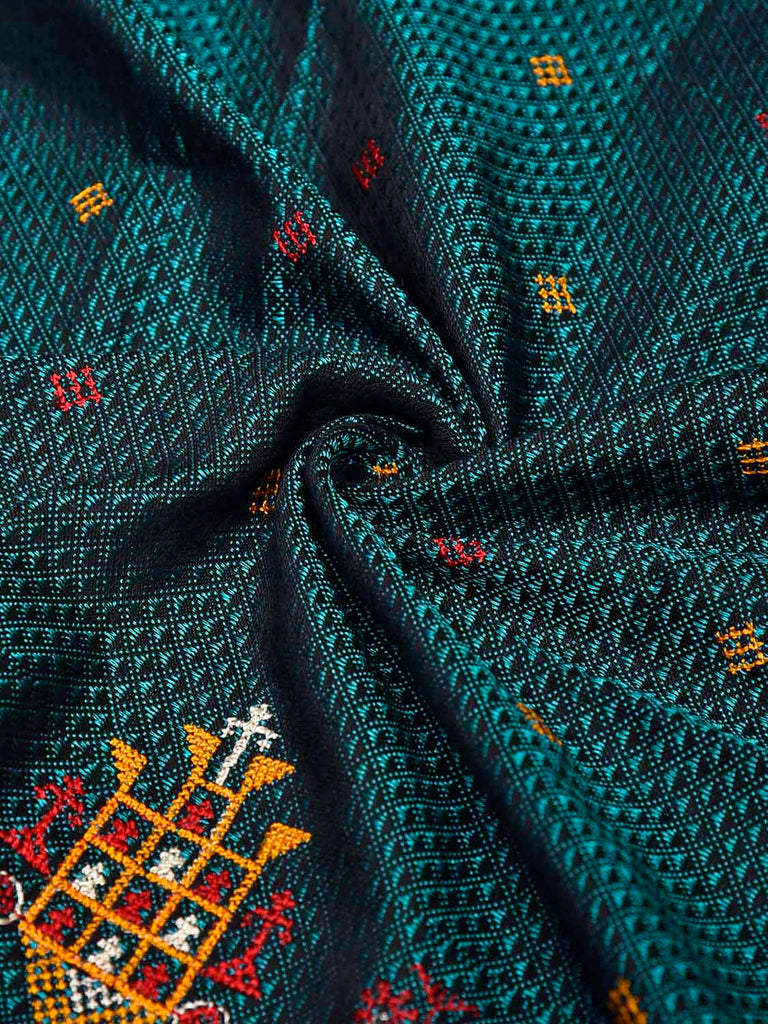Teal and Maroon Kasuti Viscose Blouse with Peacock Design Length 1mt Width 44 Inches. Beautiful Pattern Blouse Fabric and Easy to Match to Any Suitable Saree. We Advise Gentle Handwash for Fabric Care.