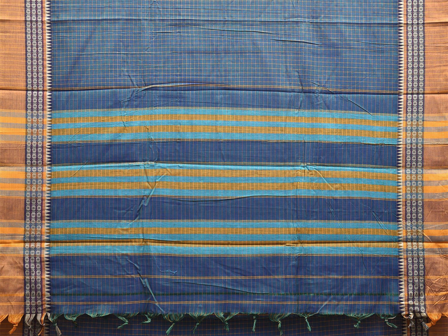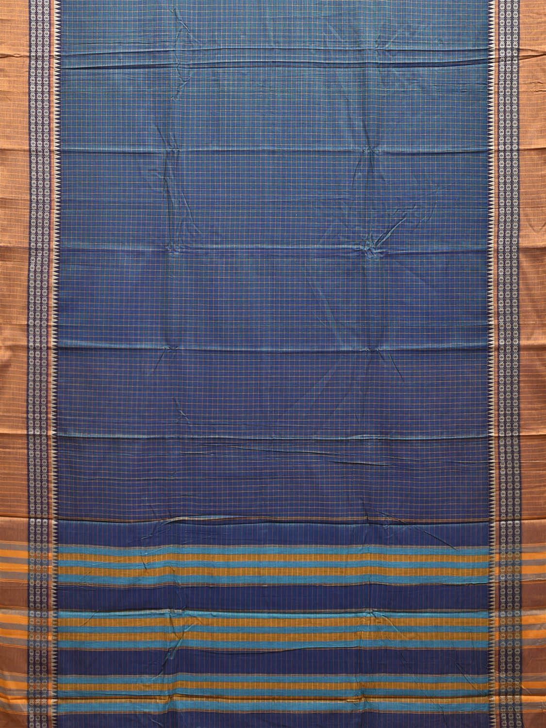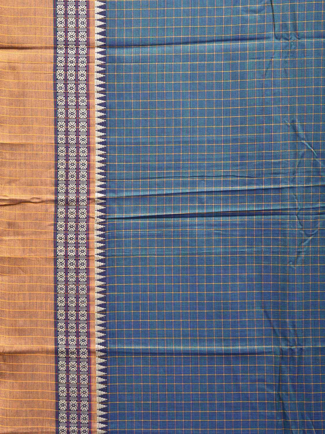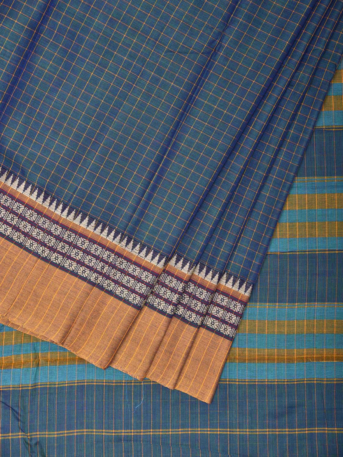 Teal and Mustard Narayanpet Cotton Saree with Checks Design No Blouse. This saree has no blouse.