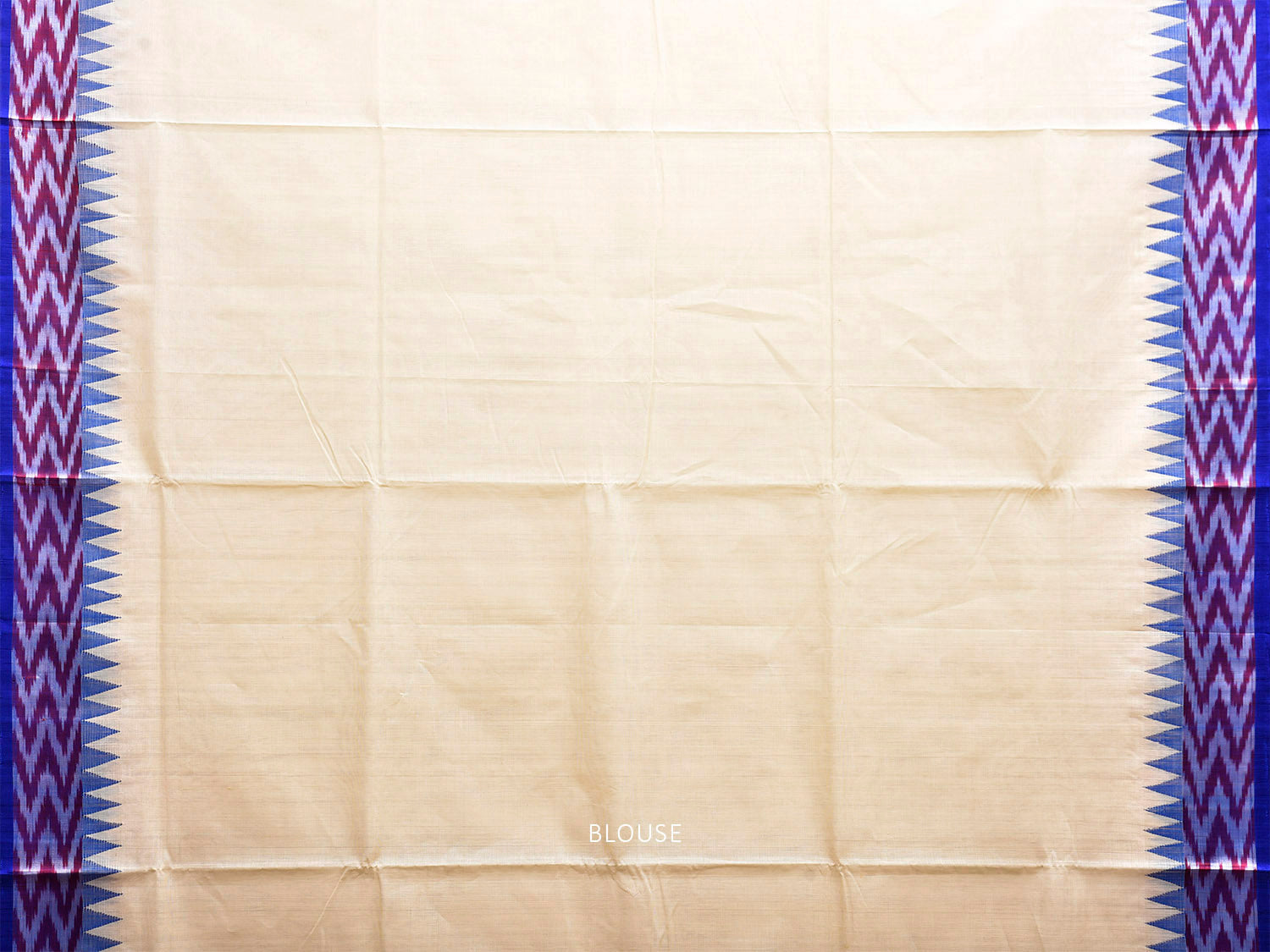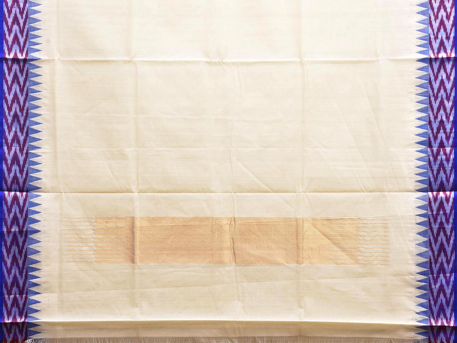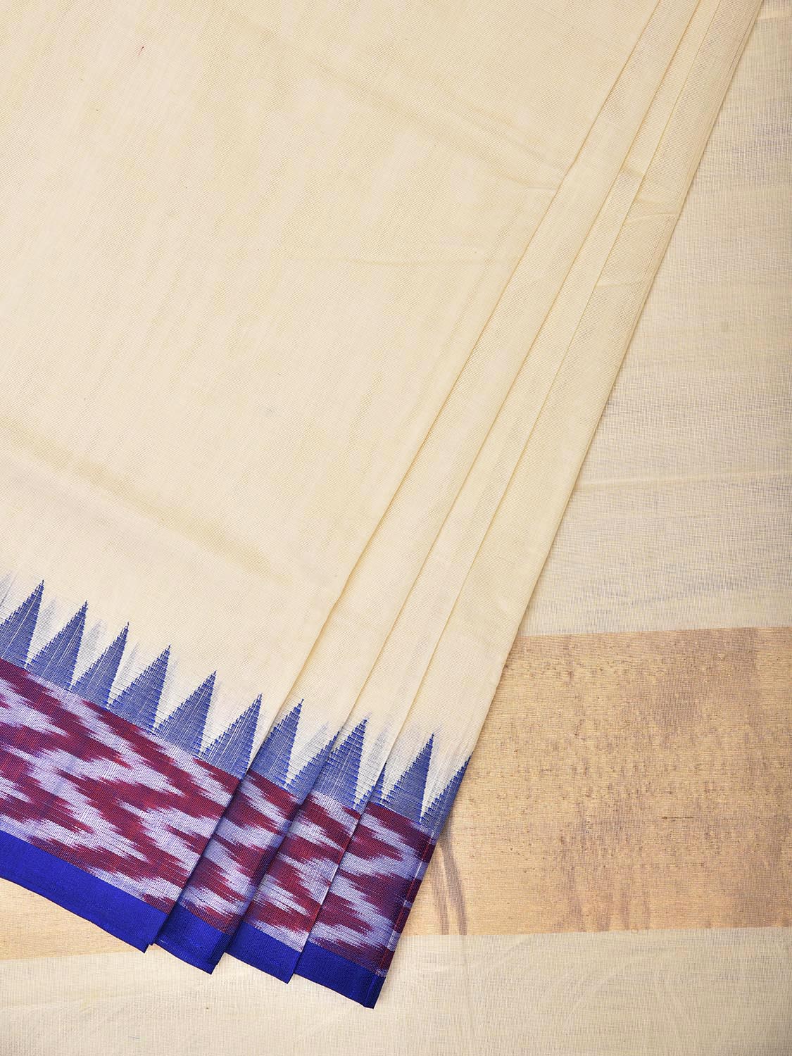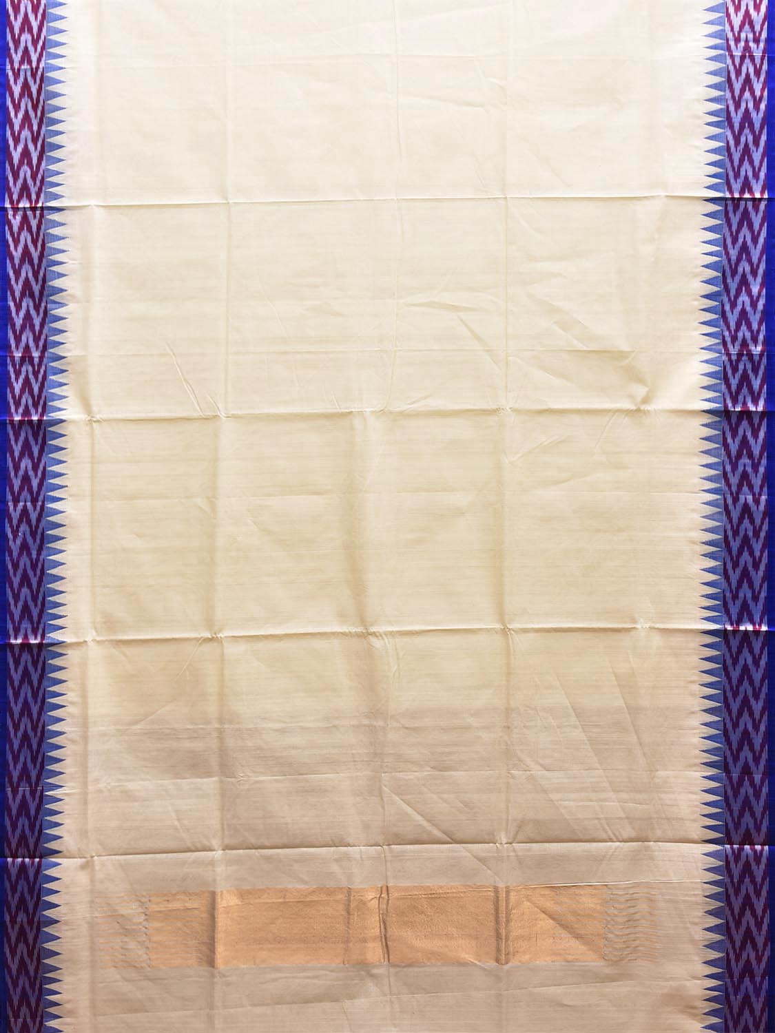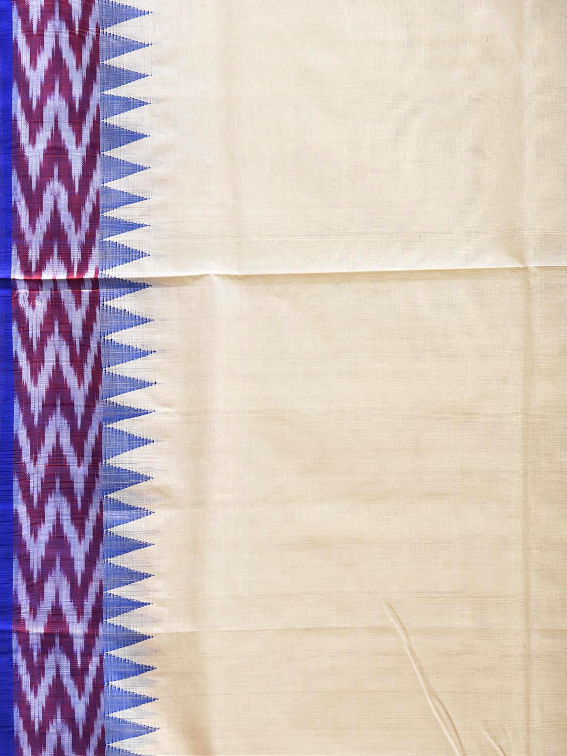 White and Blue Khadi Cotton Handloom Plain Saree with Ikat-Temple Border Design. Khadi saree is primarily woven from cotton and may also include silk, or wool. It is a versatile fabric, cool in summer and warm in winter. For fabric care we advise dry clean.