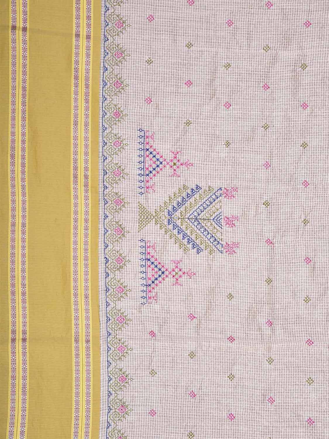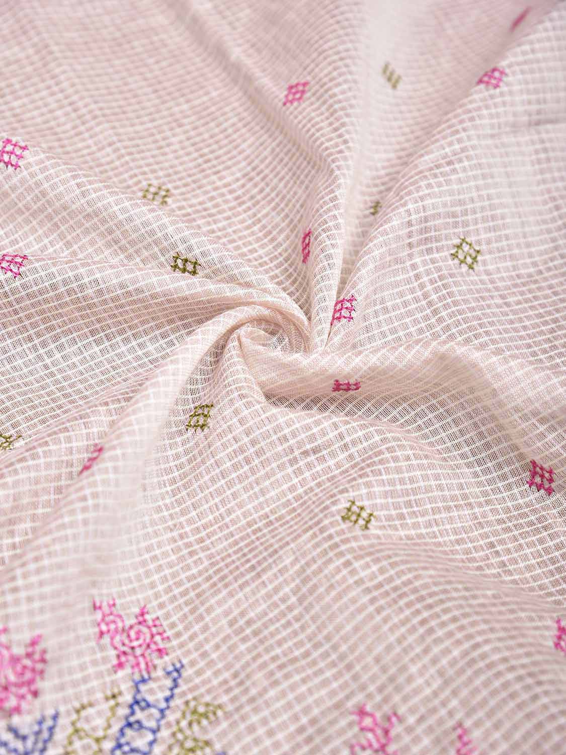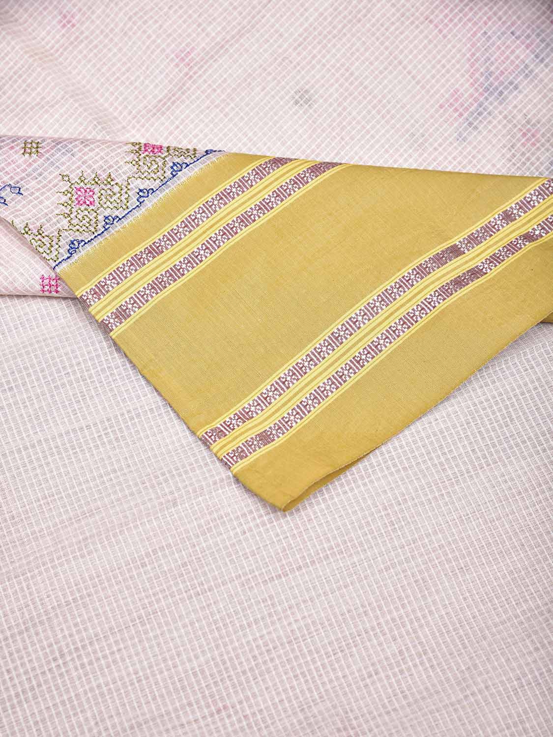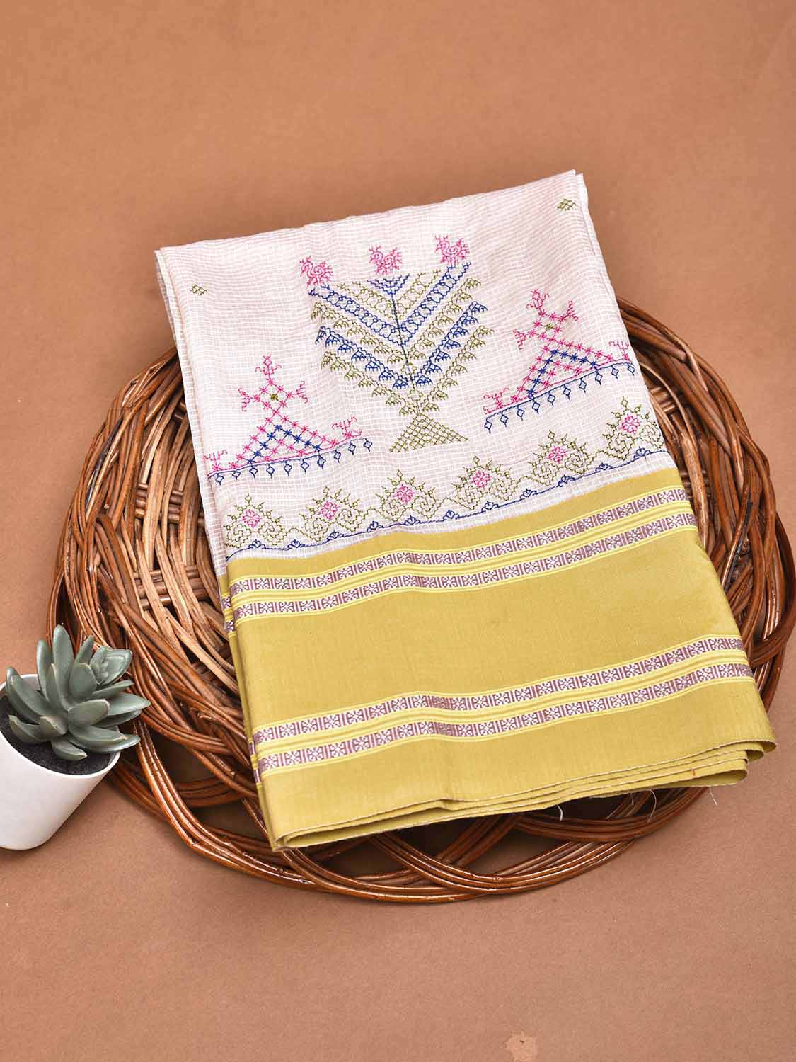White and Light Olive Kasuti Bamboo Cotton Blouse with Small Checks Design Length 1mt Width 42 Inches. Beautiful Pattern Blouse Fabric and Easy to Match to Any Suitable Saree. We Advise Gentle Handwash for Fabric Care.