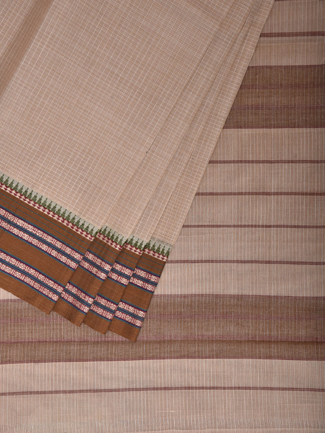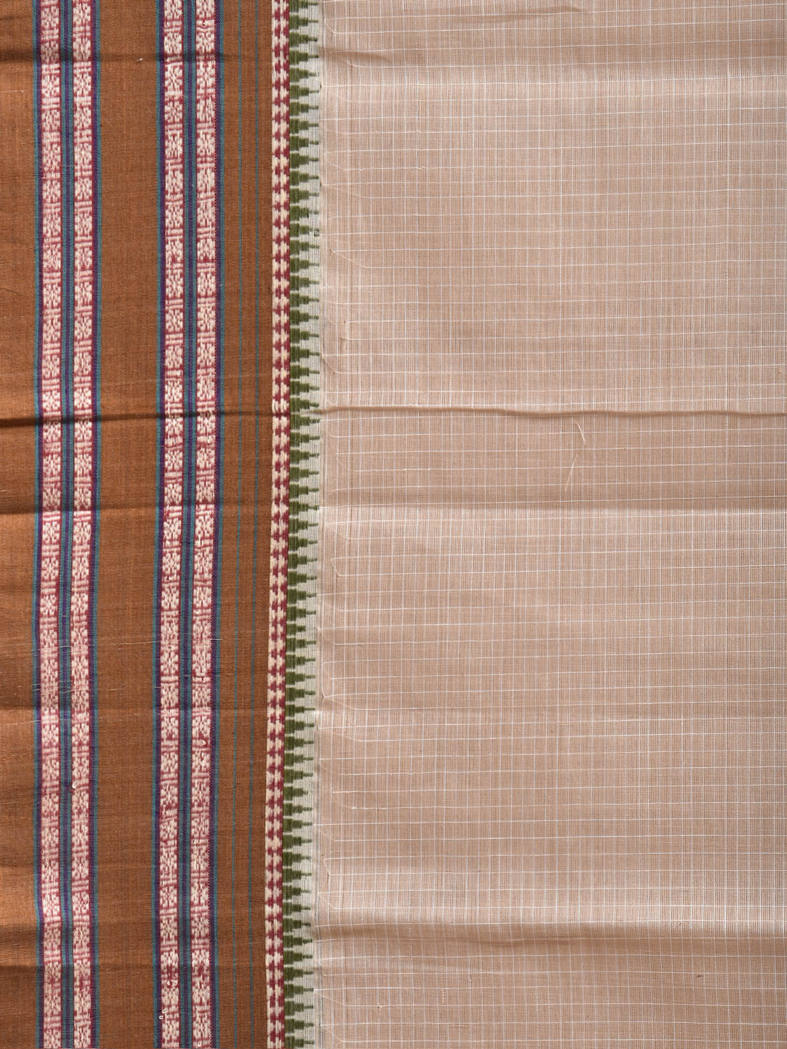 White and Olive Narayanpet Cotton Handloom Saree with Checks Design No Blouse. This saree has no blouse.