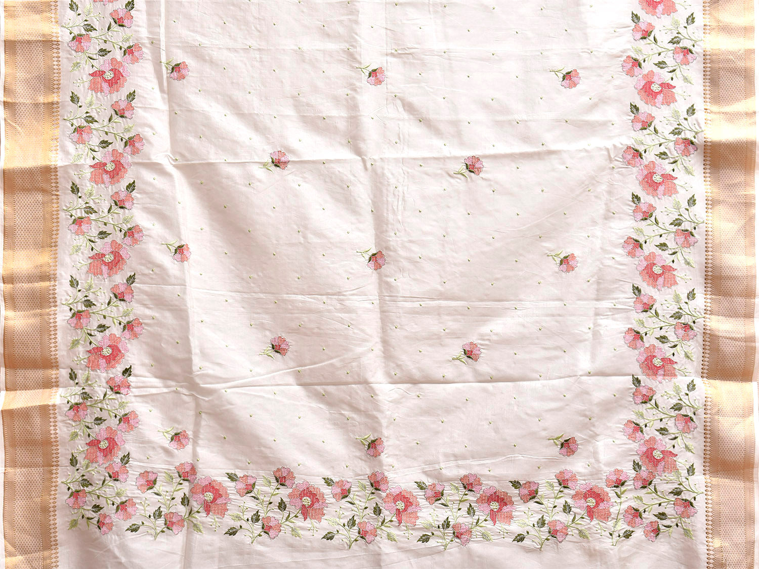 White Embroiday Cotton Viscose Saree with Petit Floral Design. For fabric care we advise dry clean.