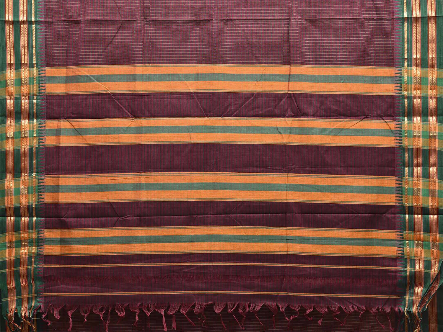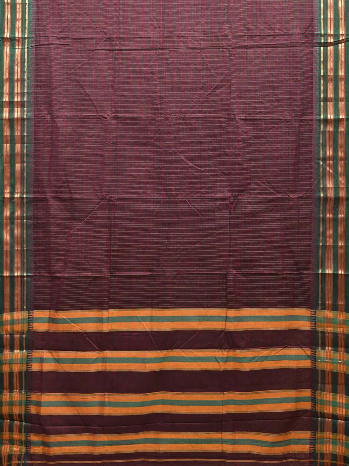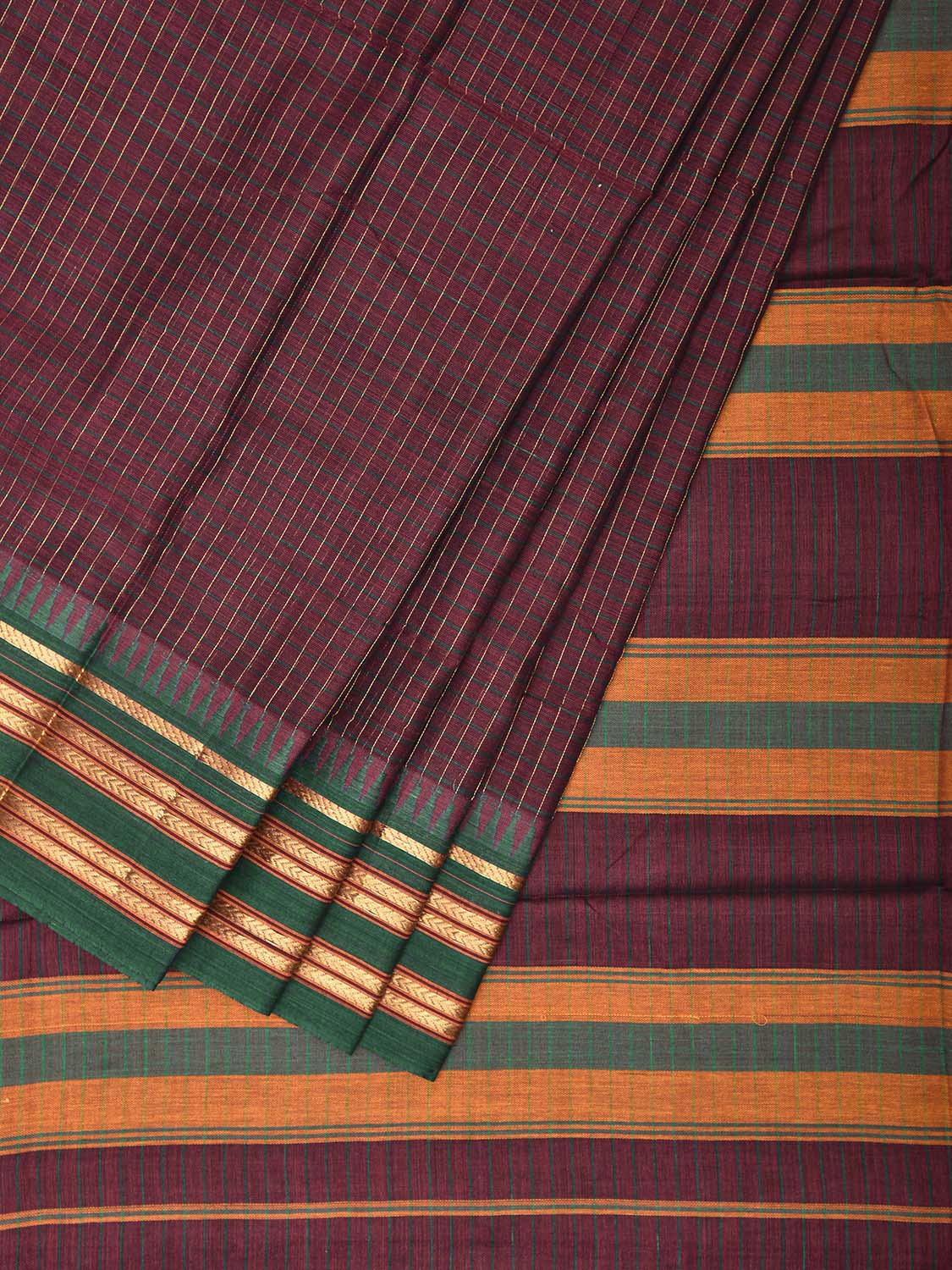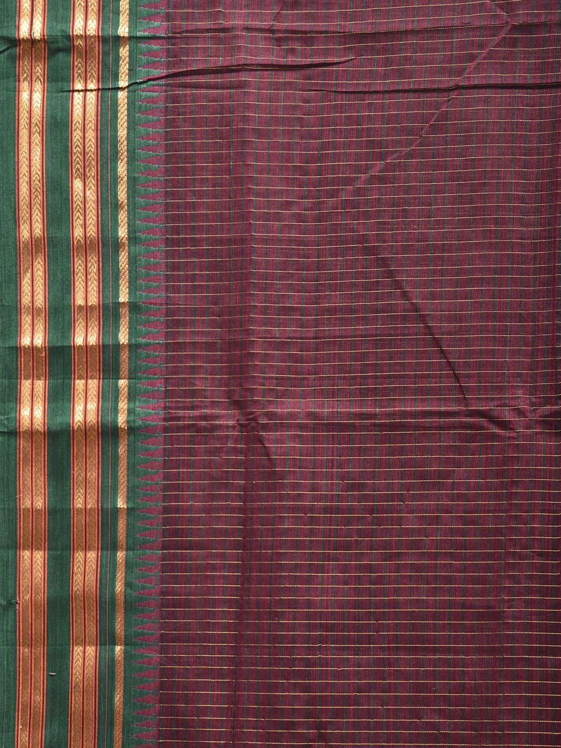 Wine and Green ilkal Cotton Viscose Saree with Checks Design No Blouse. For fabric care we advise gentle handwash separately. This saree has no blouse.