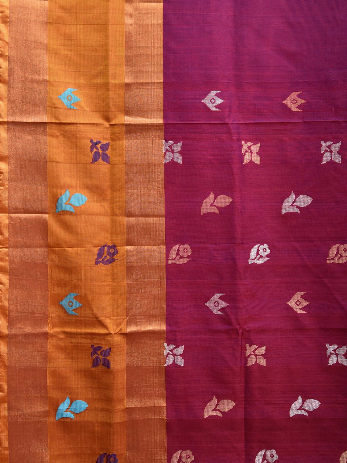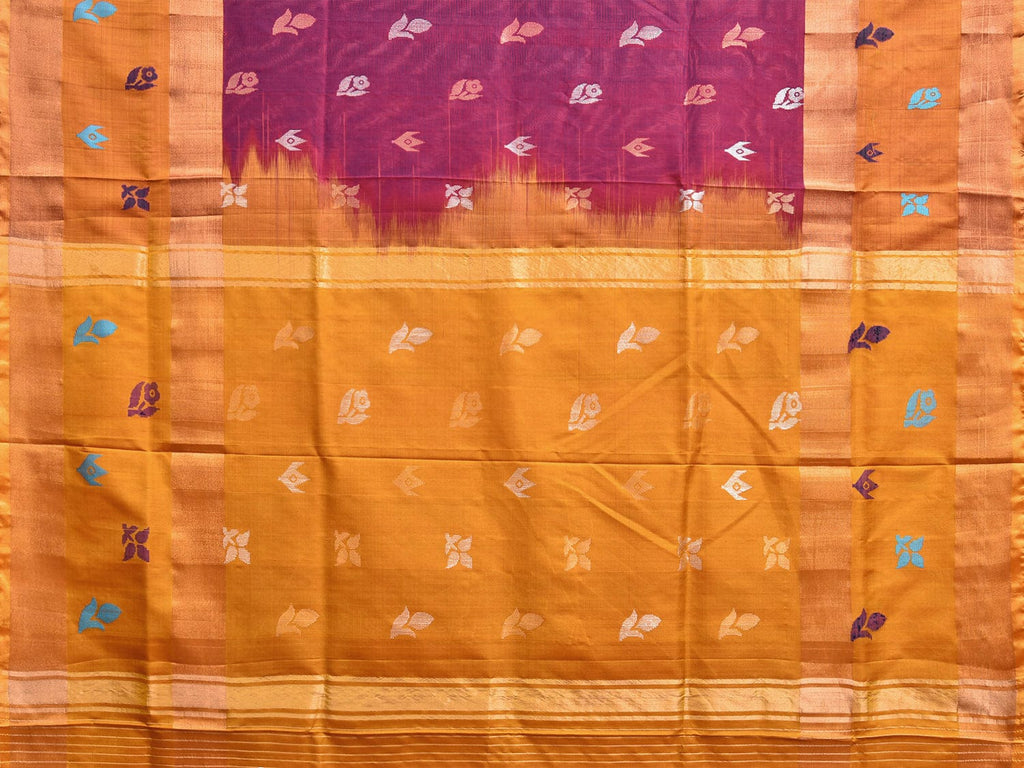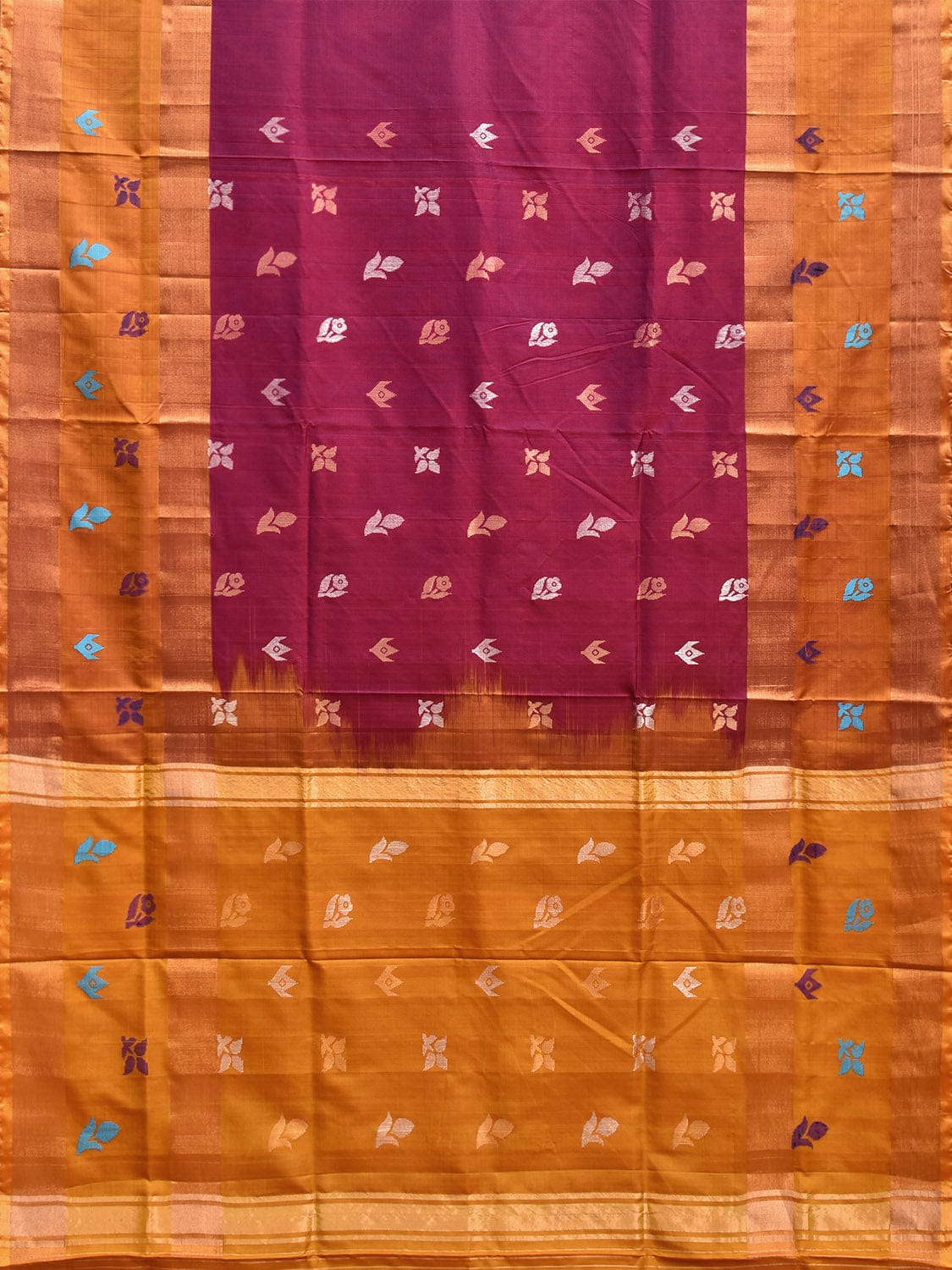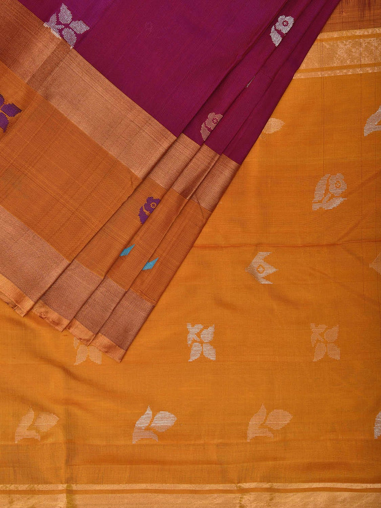 Wine and Mustard Uppada Silk Handloom Saree with Body Buta Design. Uppada sarees are known for light weight sarees with jamdani weaving technique. With so many traditional designs it is considered for the very special occasion wear. We advice dry clean for fabric care.