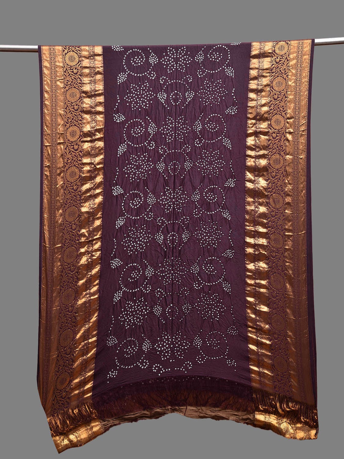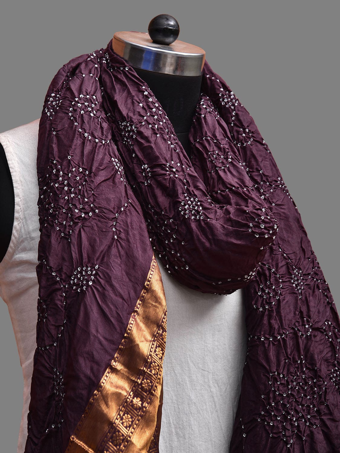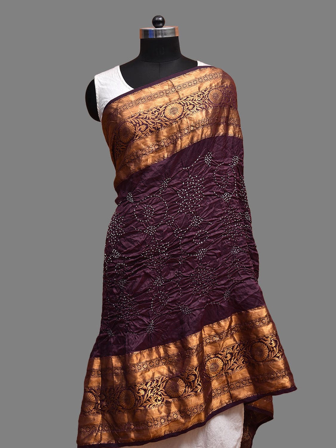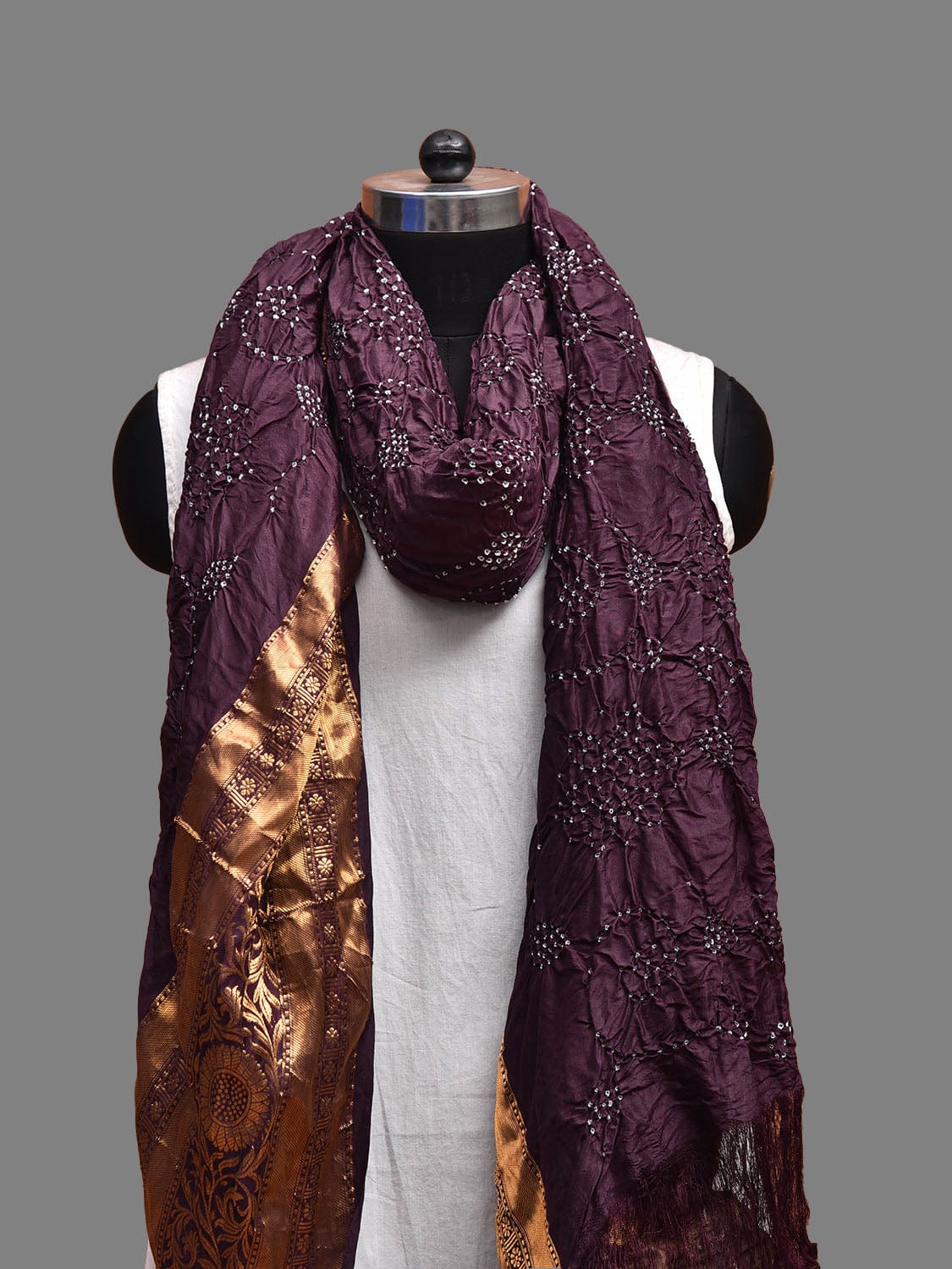 Wine Bandhani Kanchipuram Silk Handloom Dupatta with Floral and Border Design. Bandhani is done by tie-dye technique by plucking the cloth with fingernails and binding them into different designs as required. We advice dry clean for fabric care and initially soak in water (unless kalamkari work) following with steam iron or rolling of saree before use.