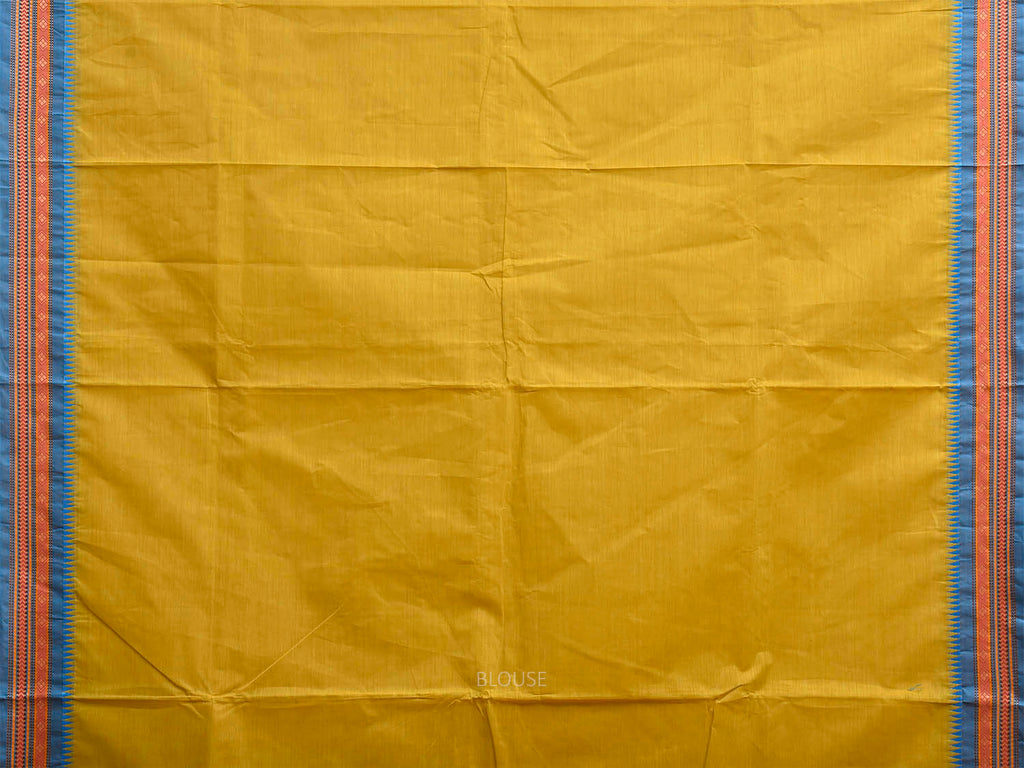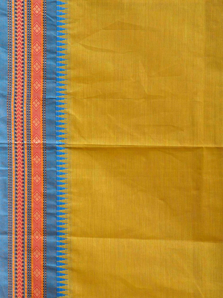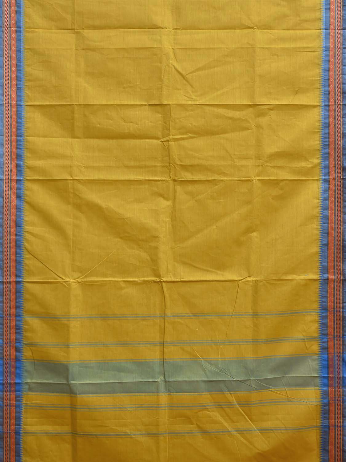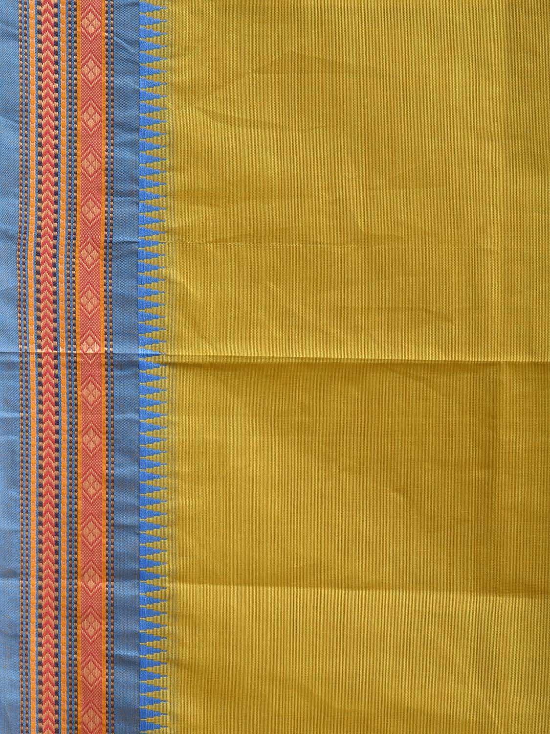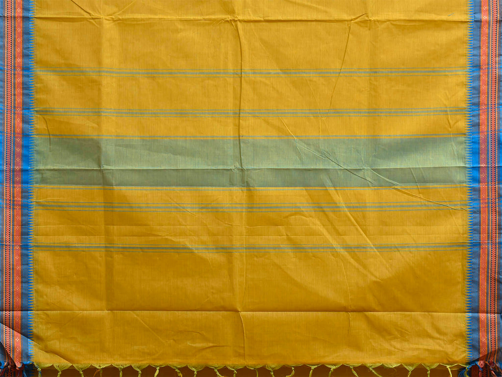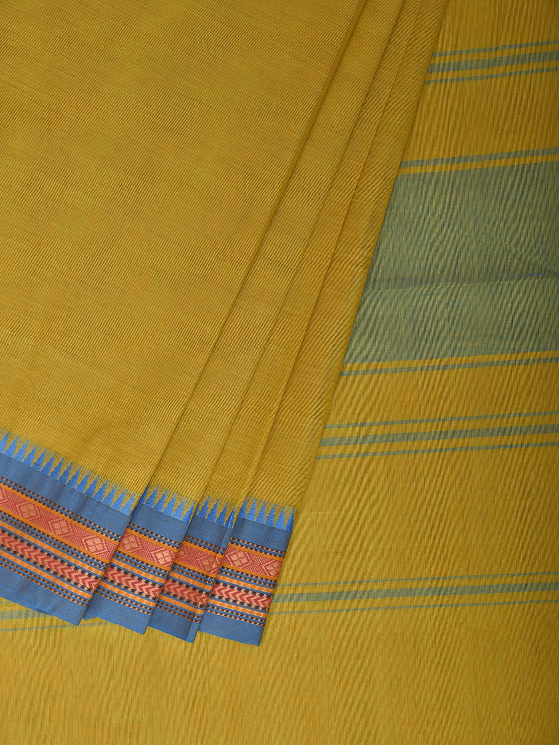 Yellow and Blue Kanchipuram Cotton Plain Saree with Border and Strips Pallu Design. Traditional Simple South Indian Attire Saree for any Casual Occasions. As it’s a cotton saree we advice gentle handwash separately for fabric care.