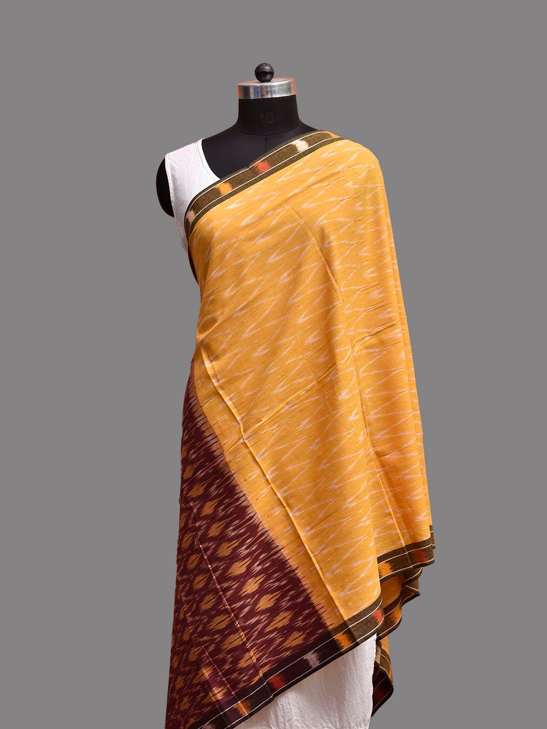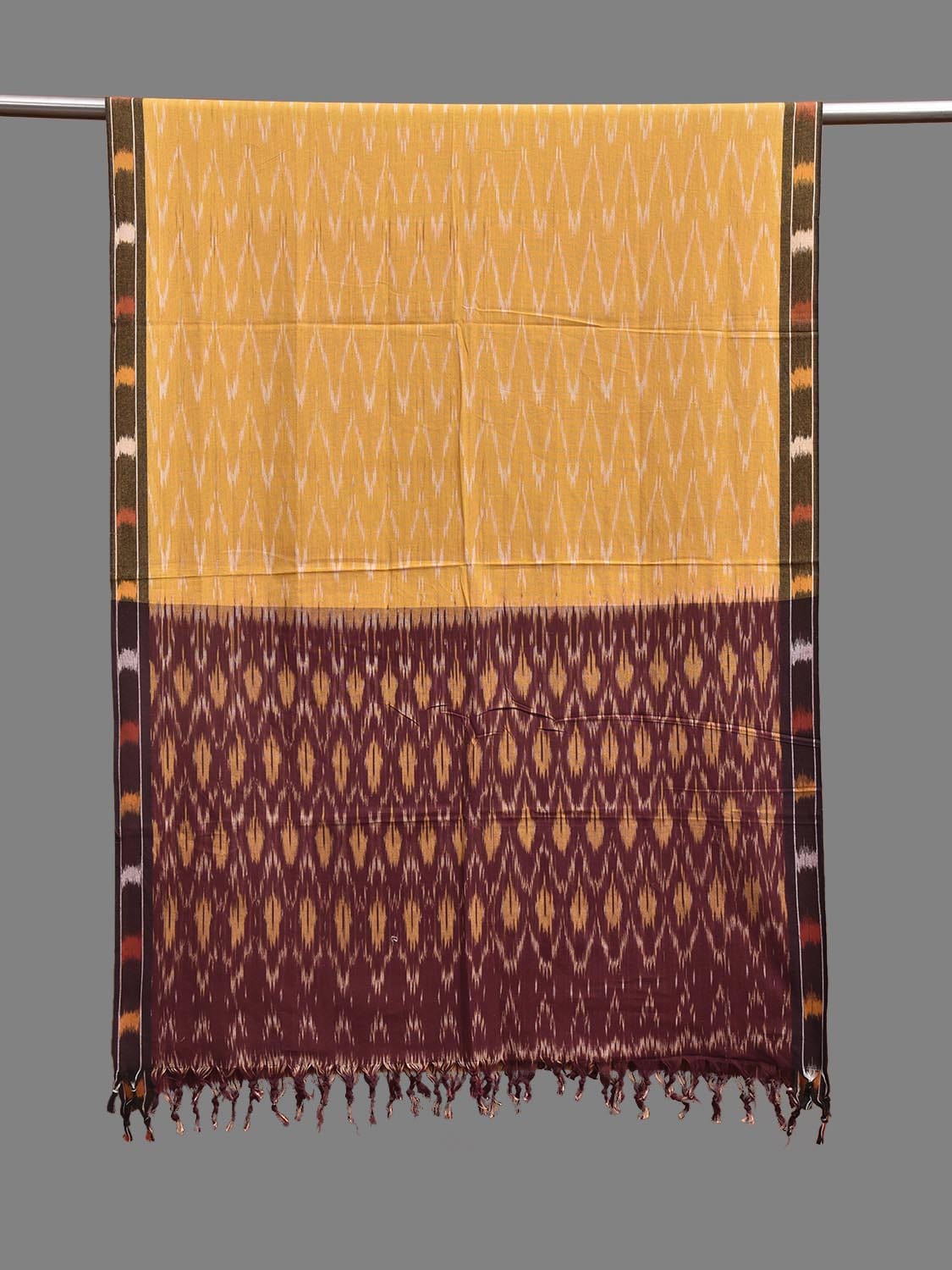 Yellow and Maroon Pochampally Ikat Cotton Handloom Dupatta with Zig-Zag Design. This Handloom Saree has been woven using the resist-dyeing, which produces the unique patterns adorning the fabric. We advise gentle handwash separately for fabric care.