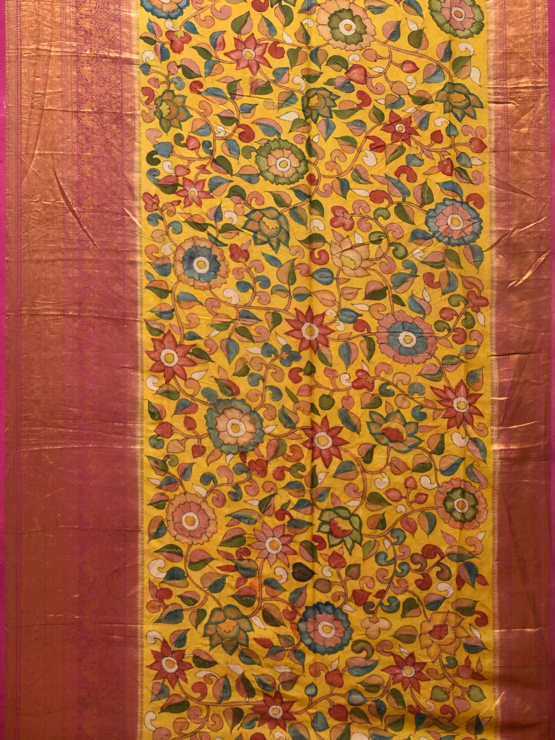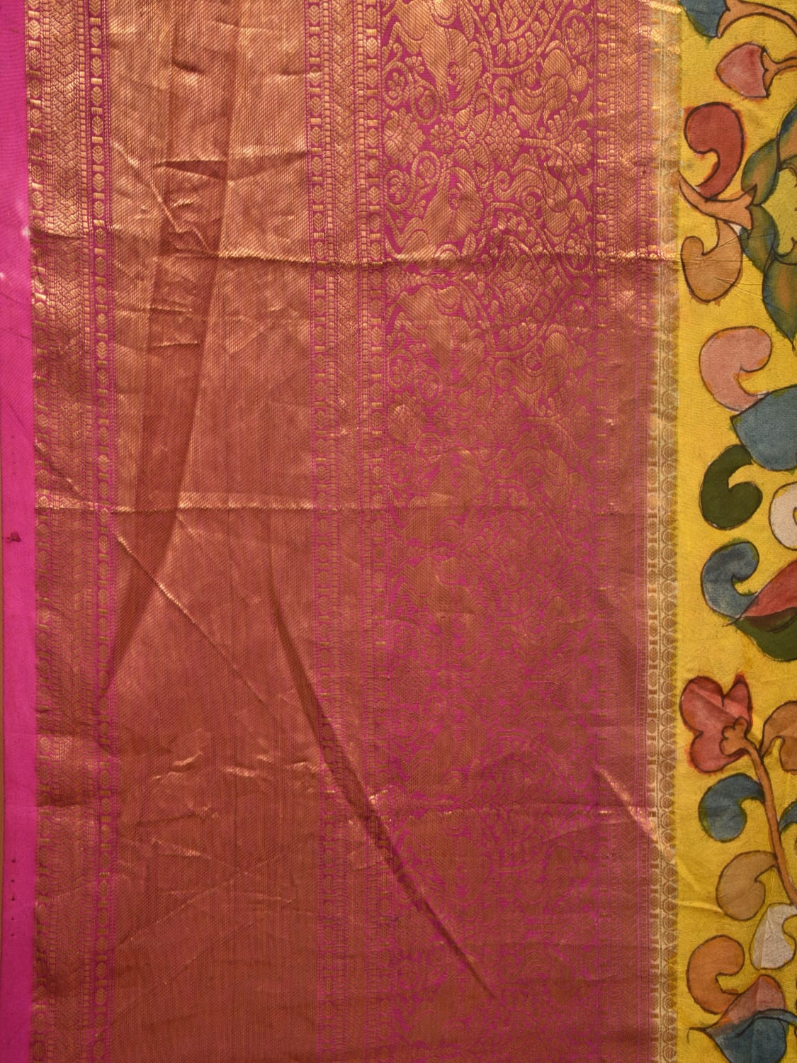 Yellow and Navy Bandhani Kanchipuram Silk Handloom Saree with Body Kalamkari Design. Bandhani is done by tie-dye technique by plucking the cloth with fingernails and binding them into different designs as required. We advice dry clean for fabric care and initially soak in water (unless kalamkari work) following with steam iron or rolling of saree before use.