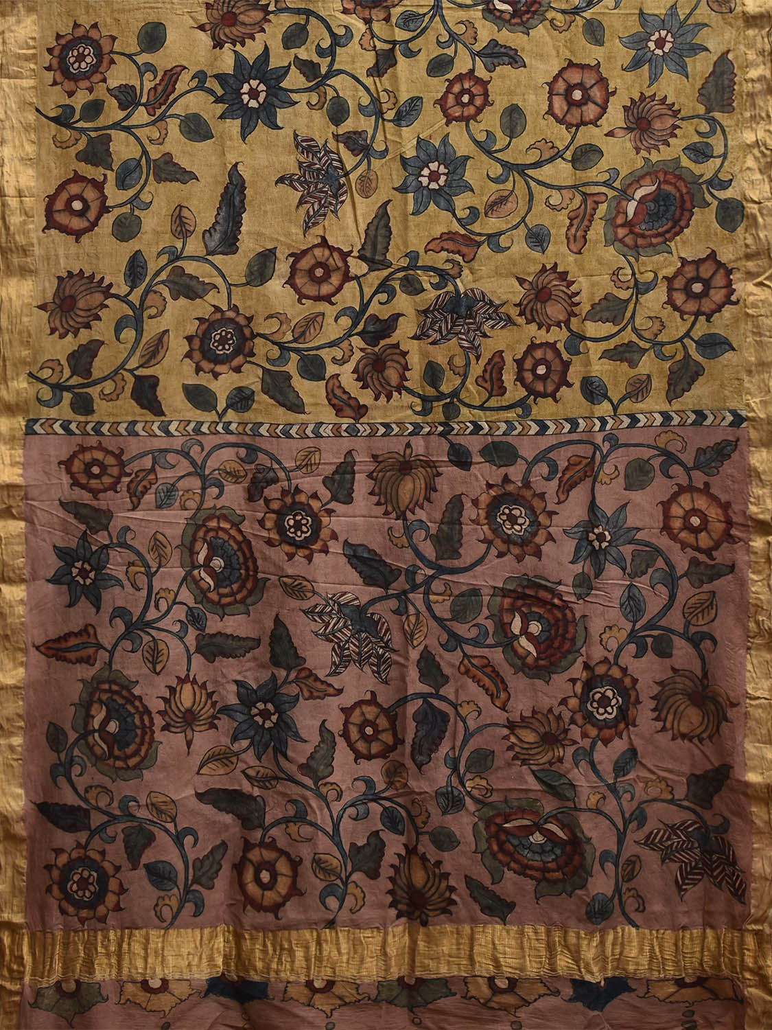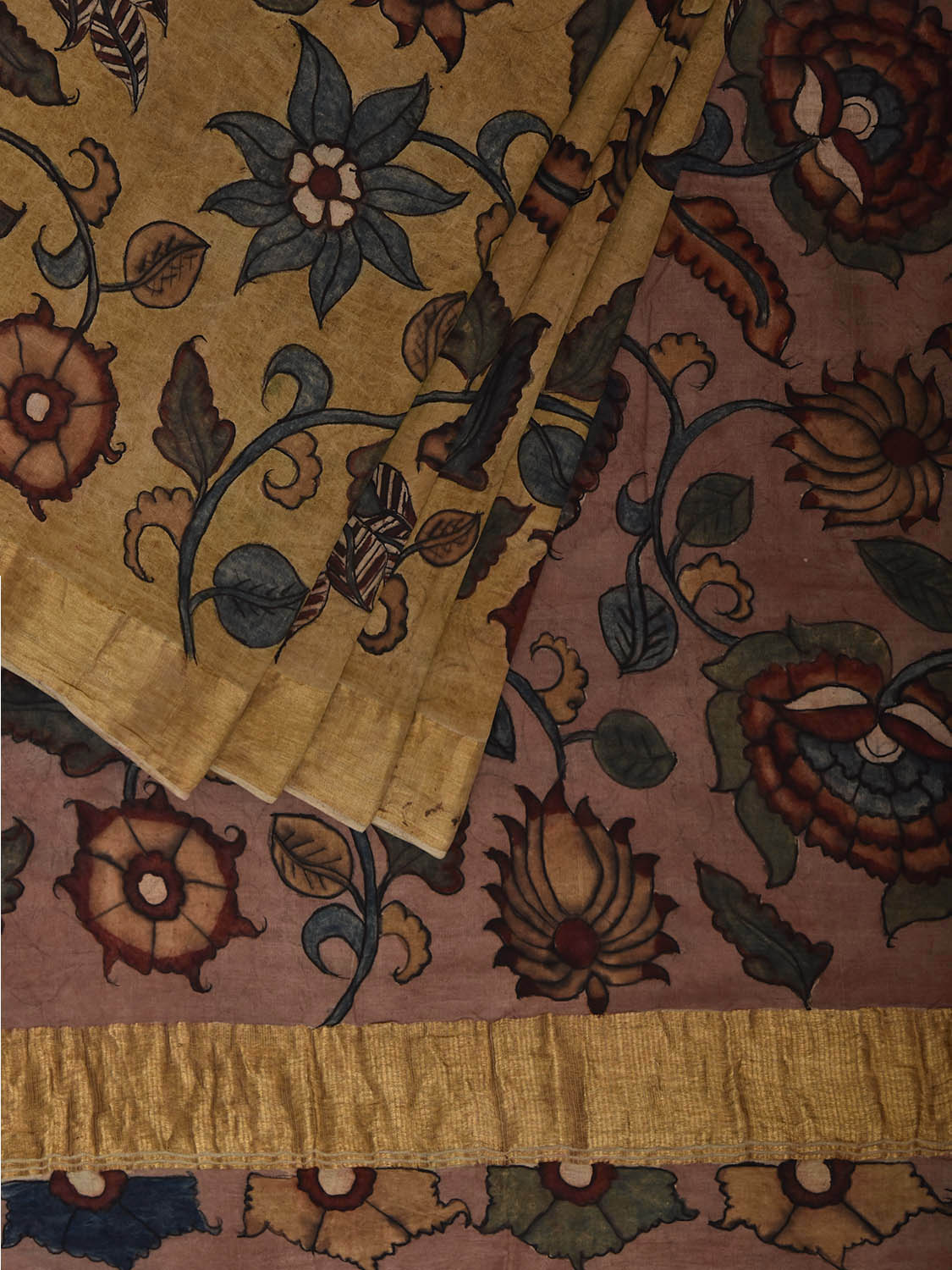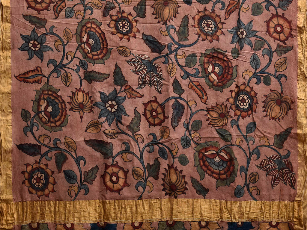 Yellow and Peach Kalamkari Hand Painted Cotton Saree with Floral Design. This hand painted kalamkari is done using natural dyes. As they are natural colors they bleed with initial washes, so we suggest Dry clean.