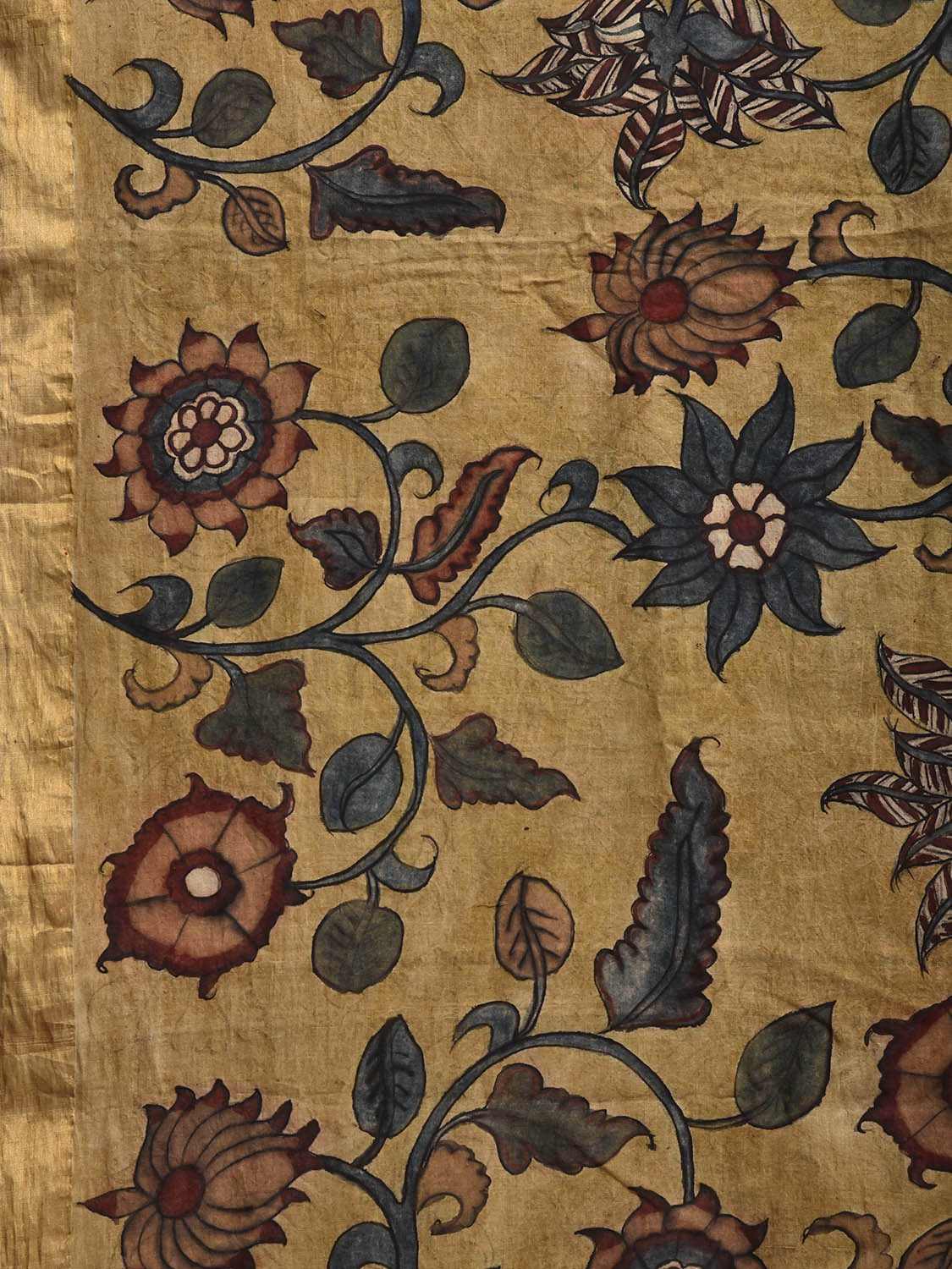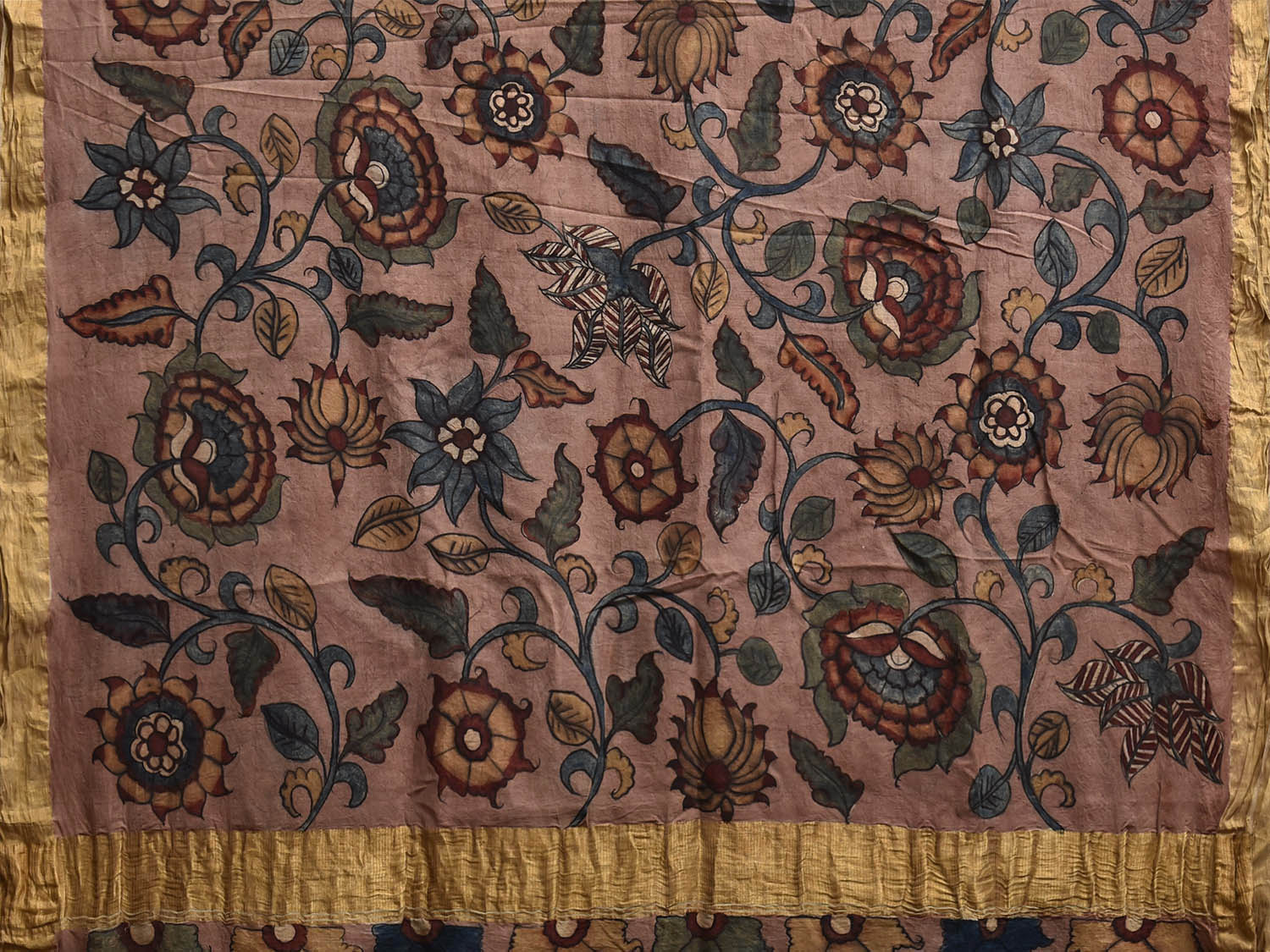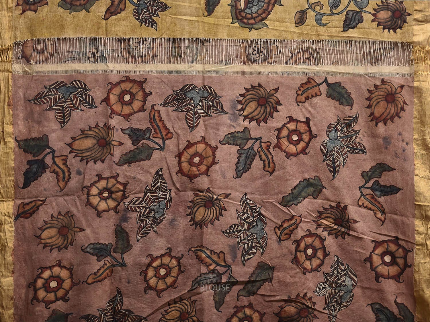Yellow and Peach Kalamkari Hand Painted Cotton Saree with Floral Design. This hand painted kalamkari is done using natural dyes. As they are natural colors they bleed with initial washes, so we suggest Dry clean.