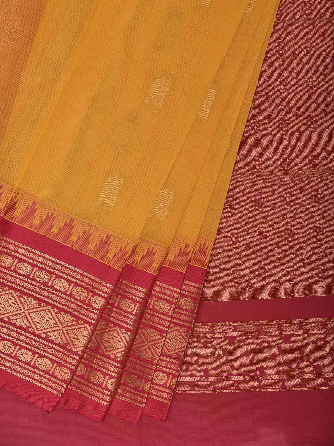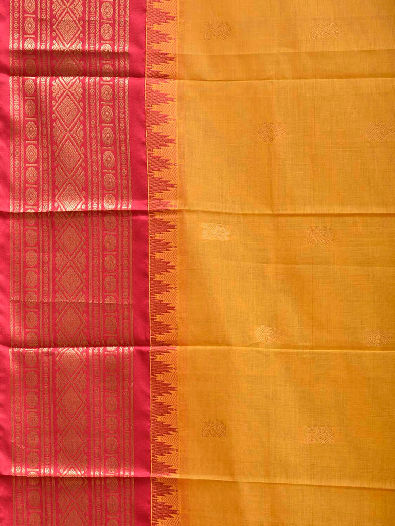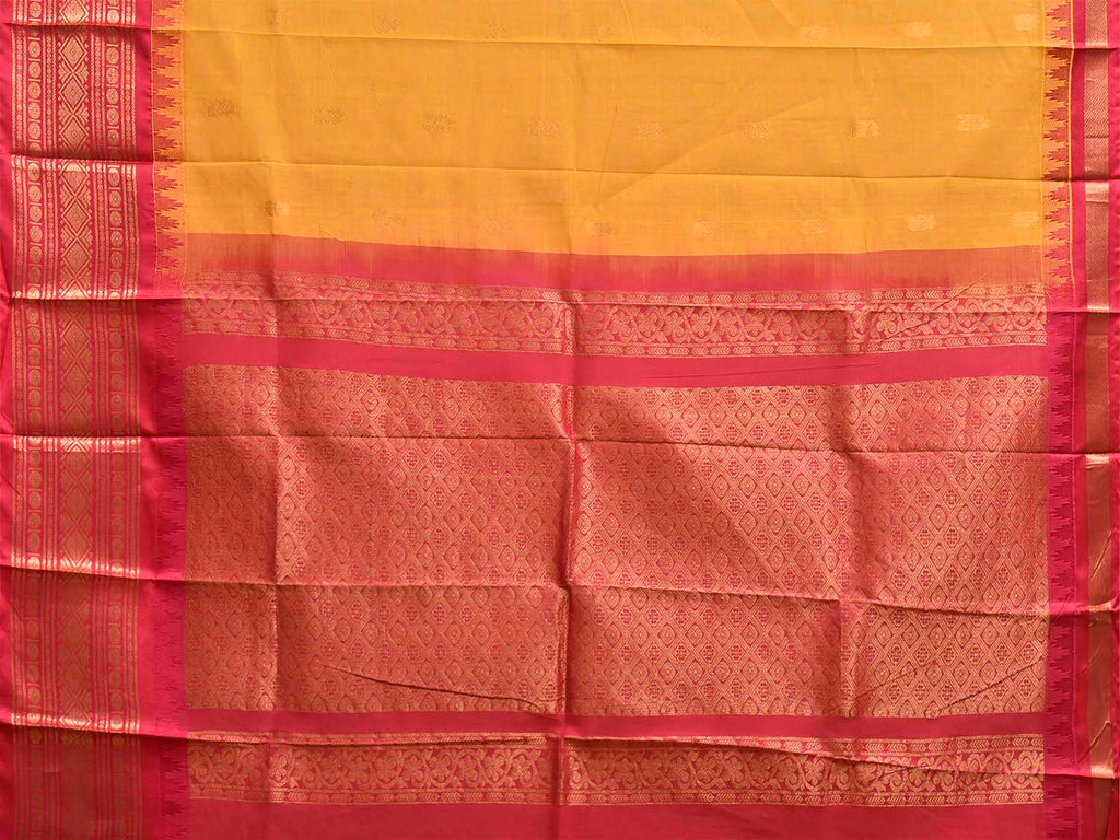 Yellow and Pink Gadwal Cotton Viscose Saree with Body Buta and Pallu Design No Blouse. Gadwal Sarees are known for their traditional design of border and pallu made of silk and body being either cotton or silk. They are known as Sico sarees for border and pallu being silk and body being cotton. We advice dry clean for fabric care. This saree has no blouse.