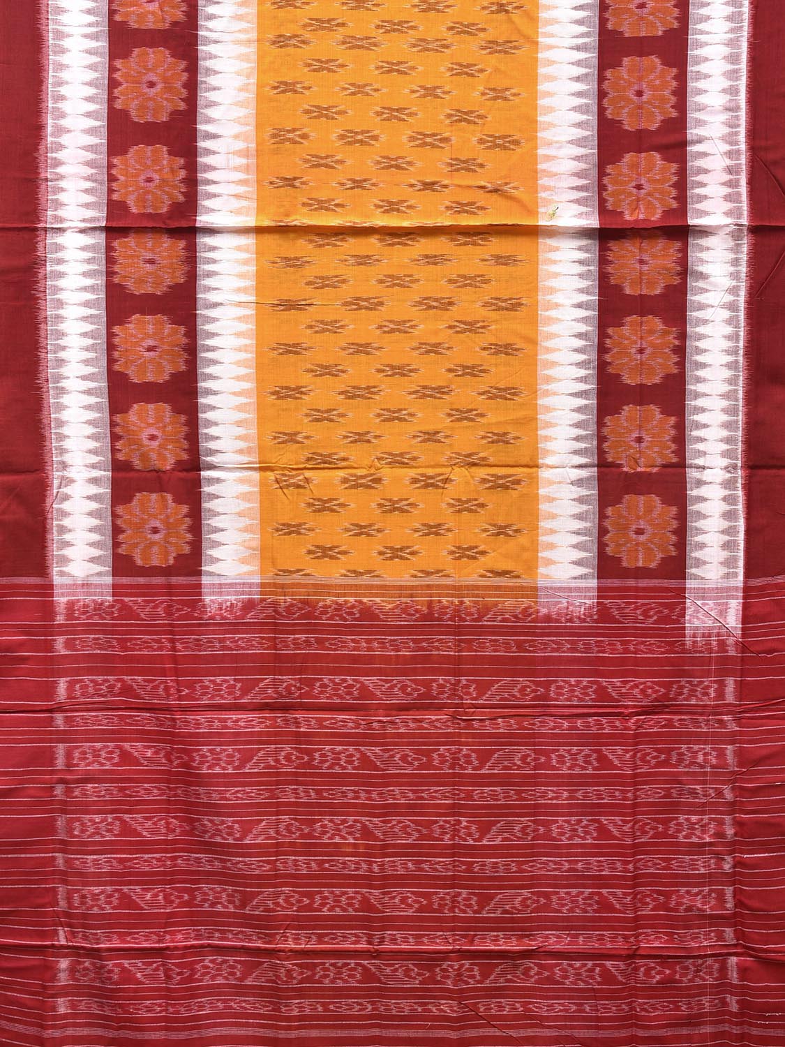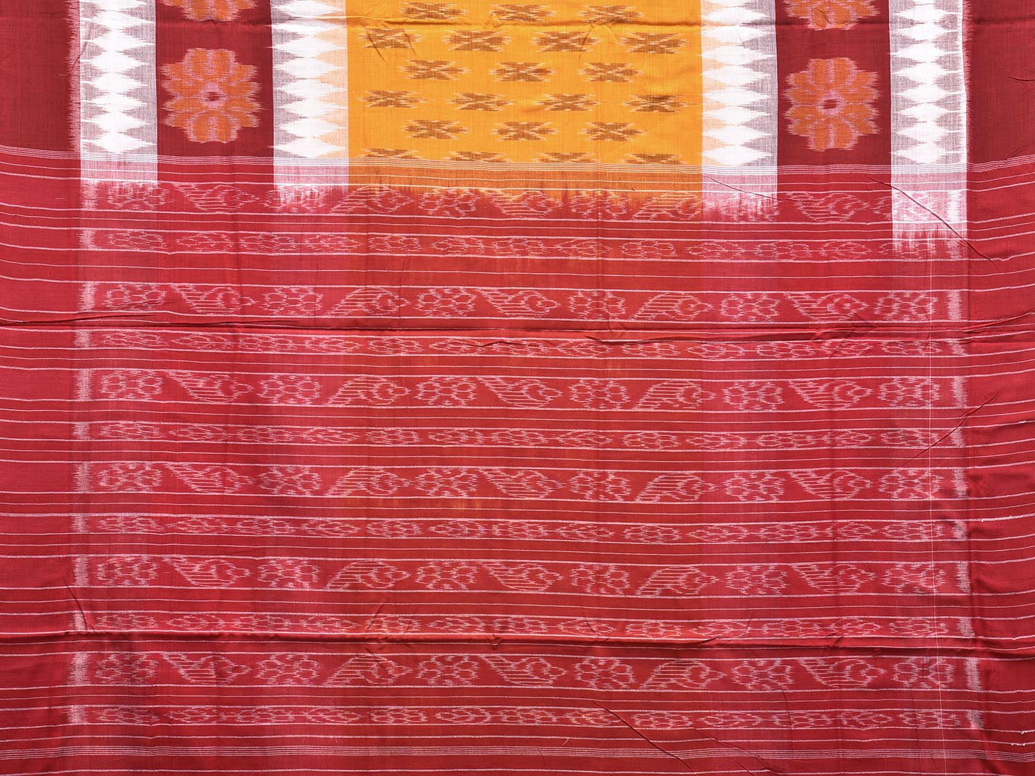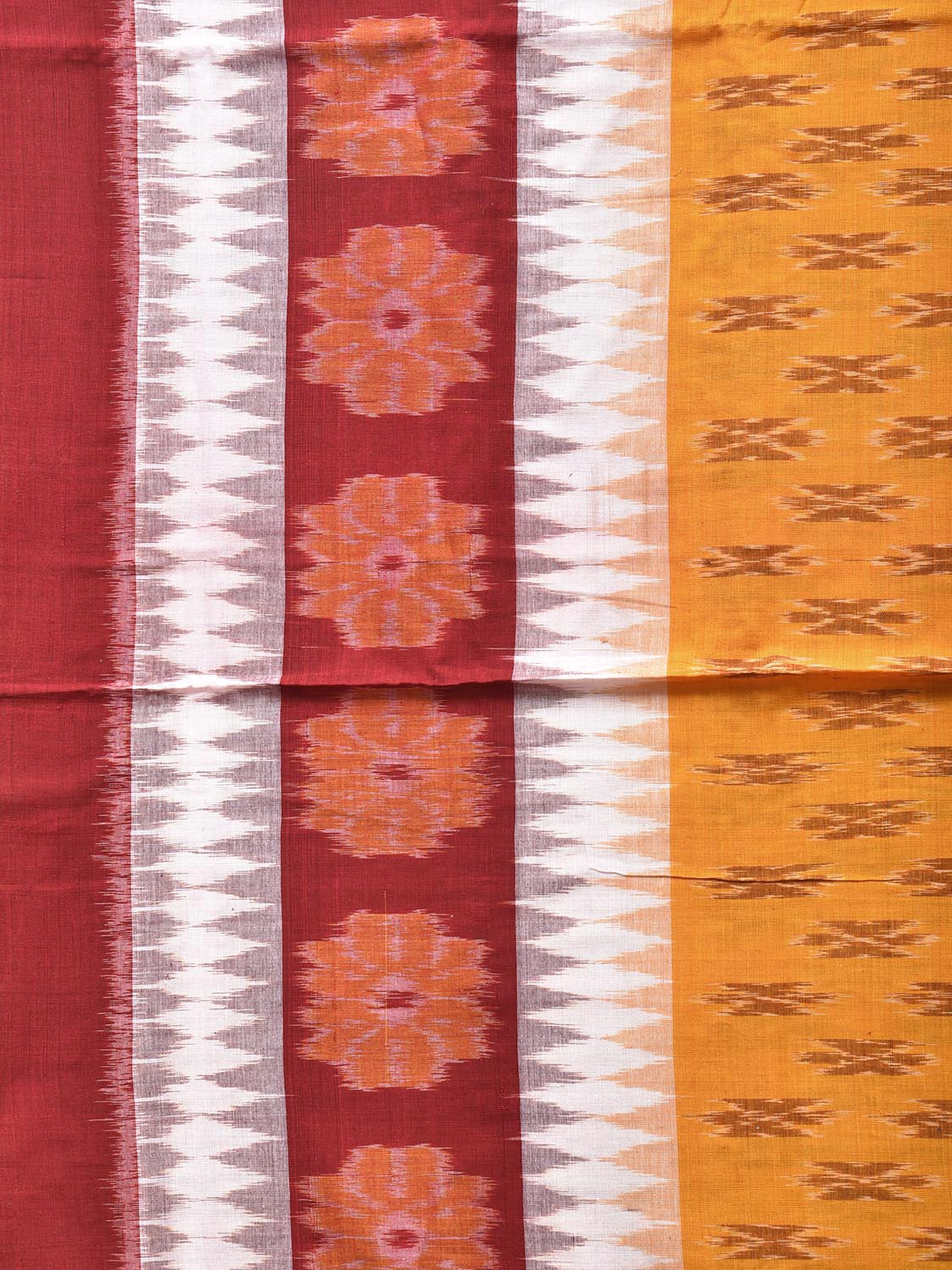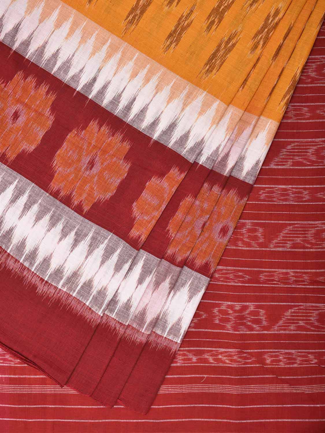 Yellow and Red Ikat Cotton Handloom Saree with Floral Body and Pallu Design No Blouse. This Handloom Saree from Andhra Pradesh has been woven using the resist-dyeing, which produces the unique patterns adorning the fabric. We advise gentle handwash separately for fabric care. This saree has no blouse.