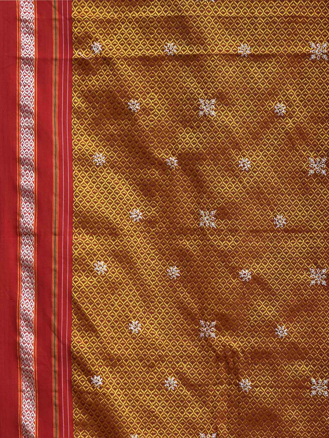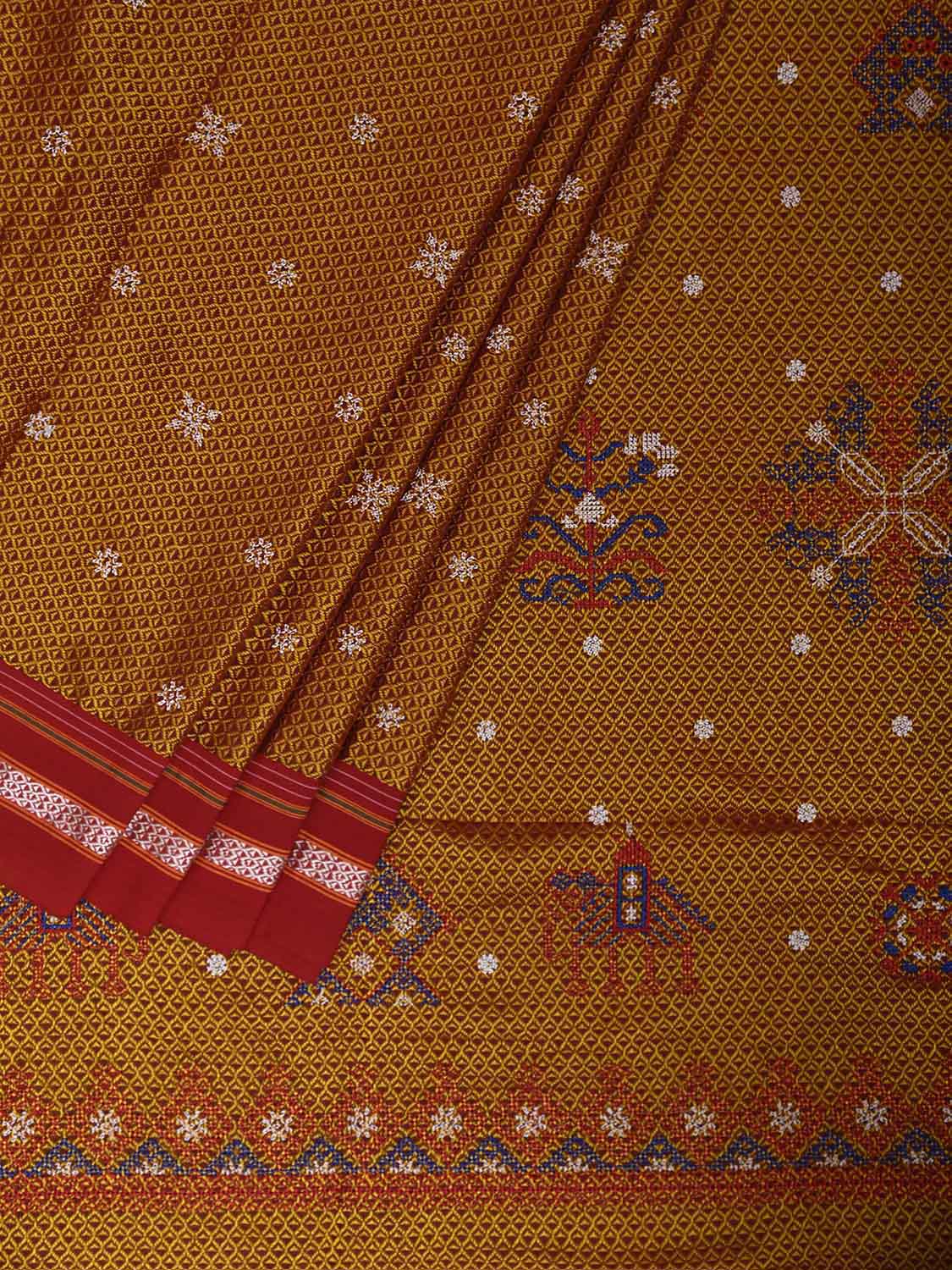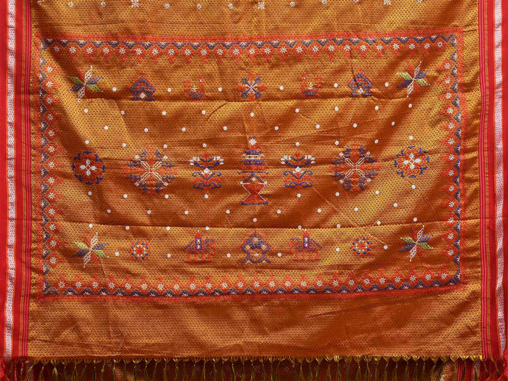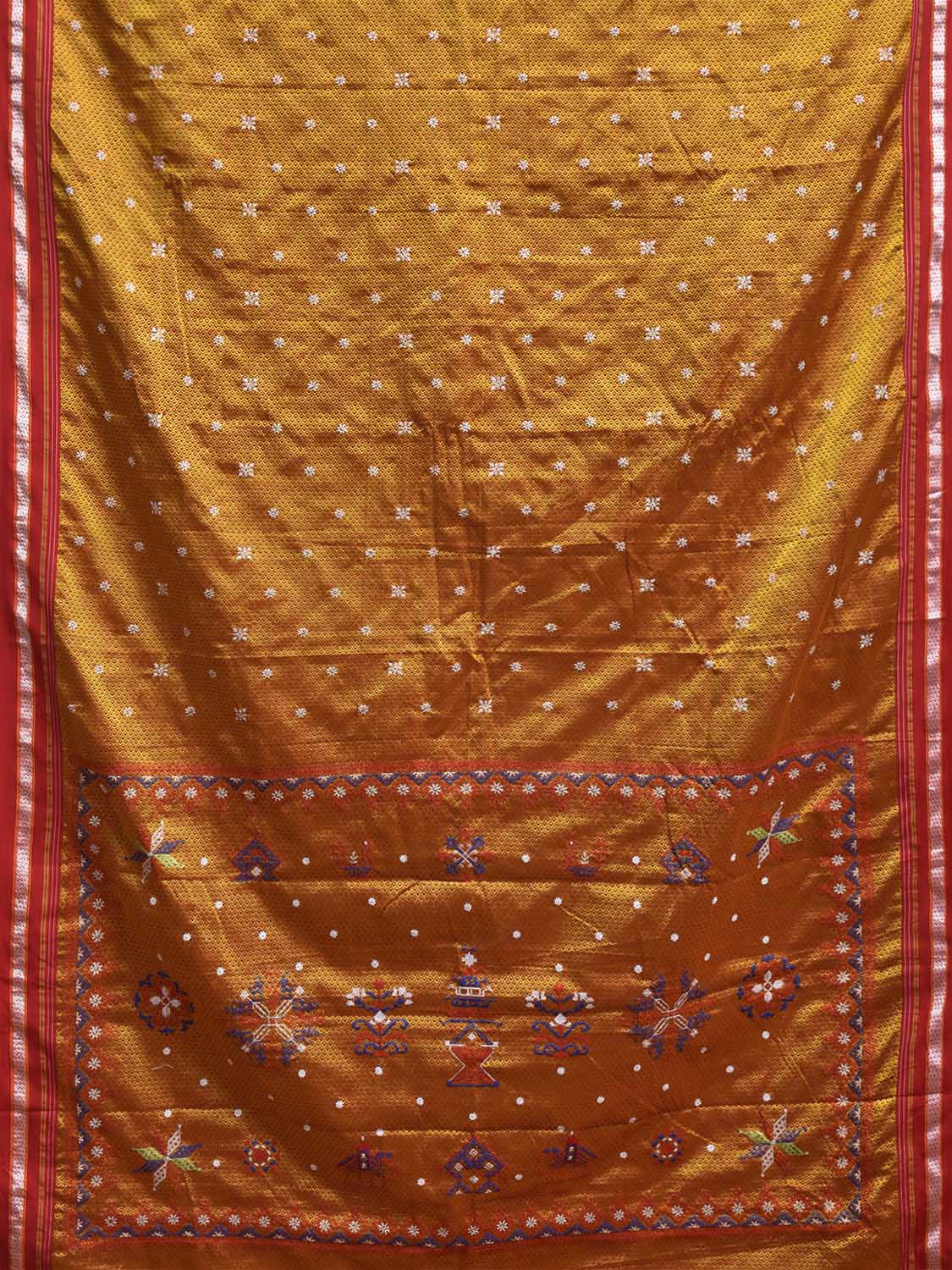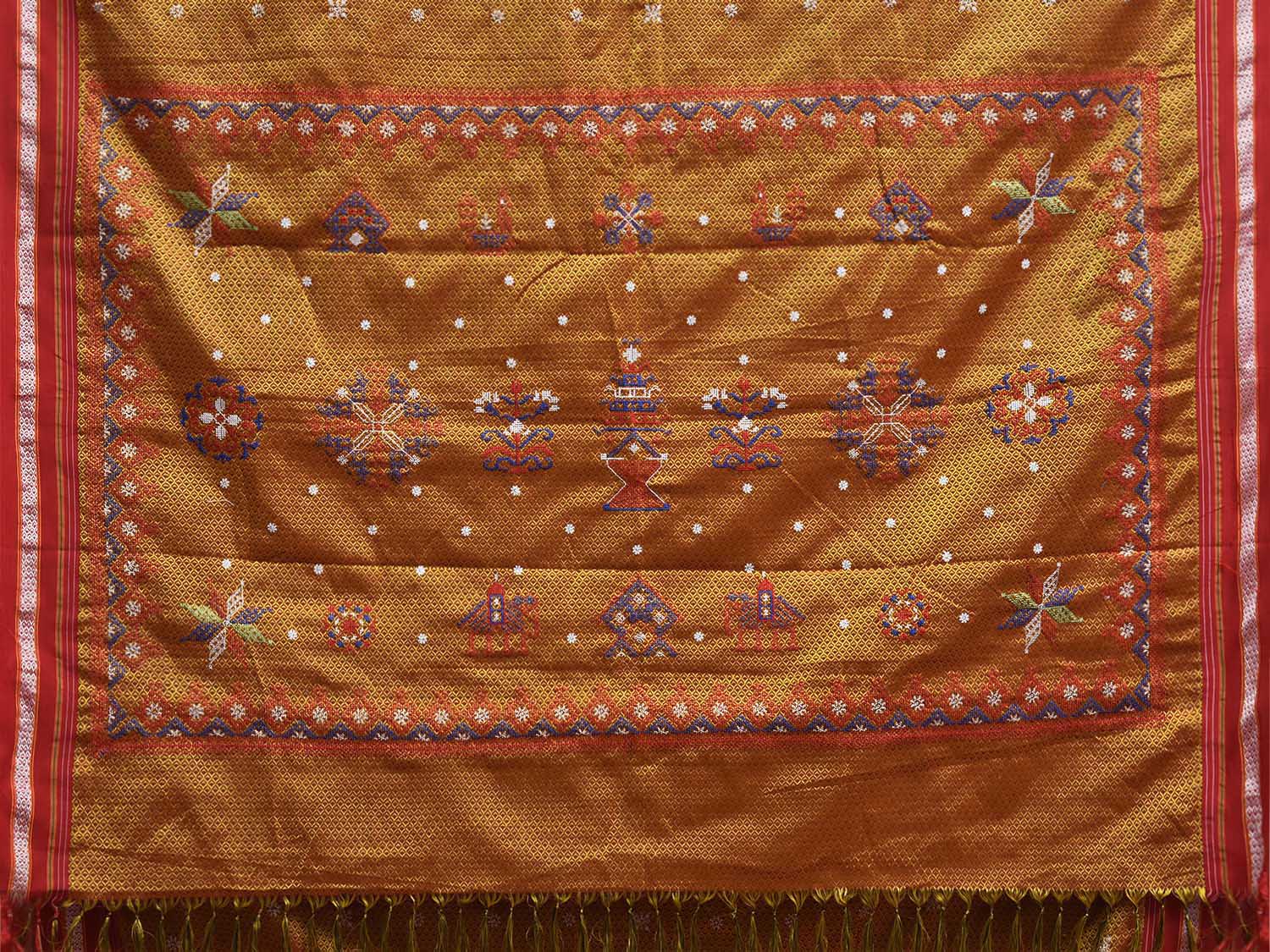Yellow and Red ilkal Jacquard Viscose Saree with Kasuti Work Design No Blouse. For fabric care we advise gentle handwash separately. This saree has no blouse.