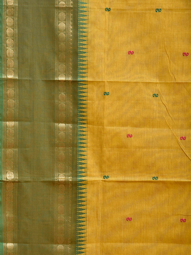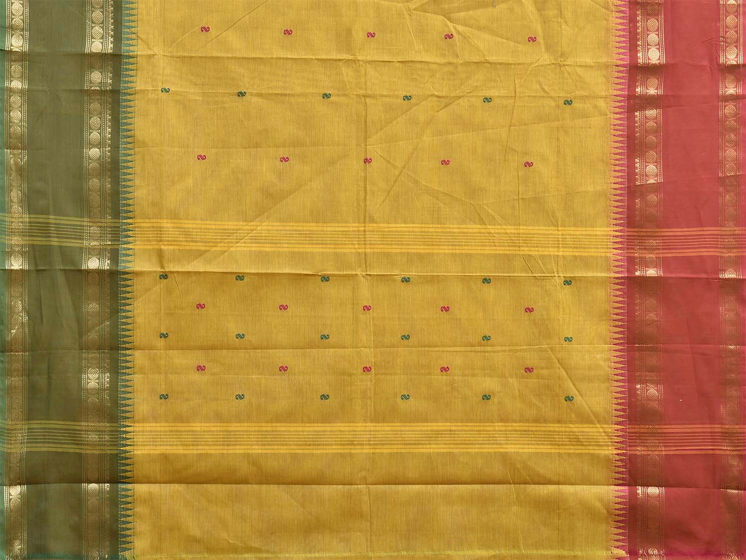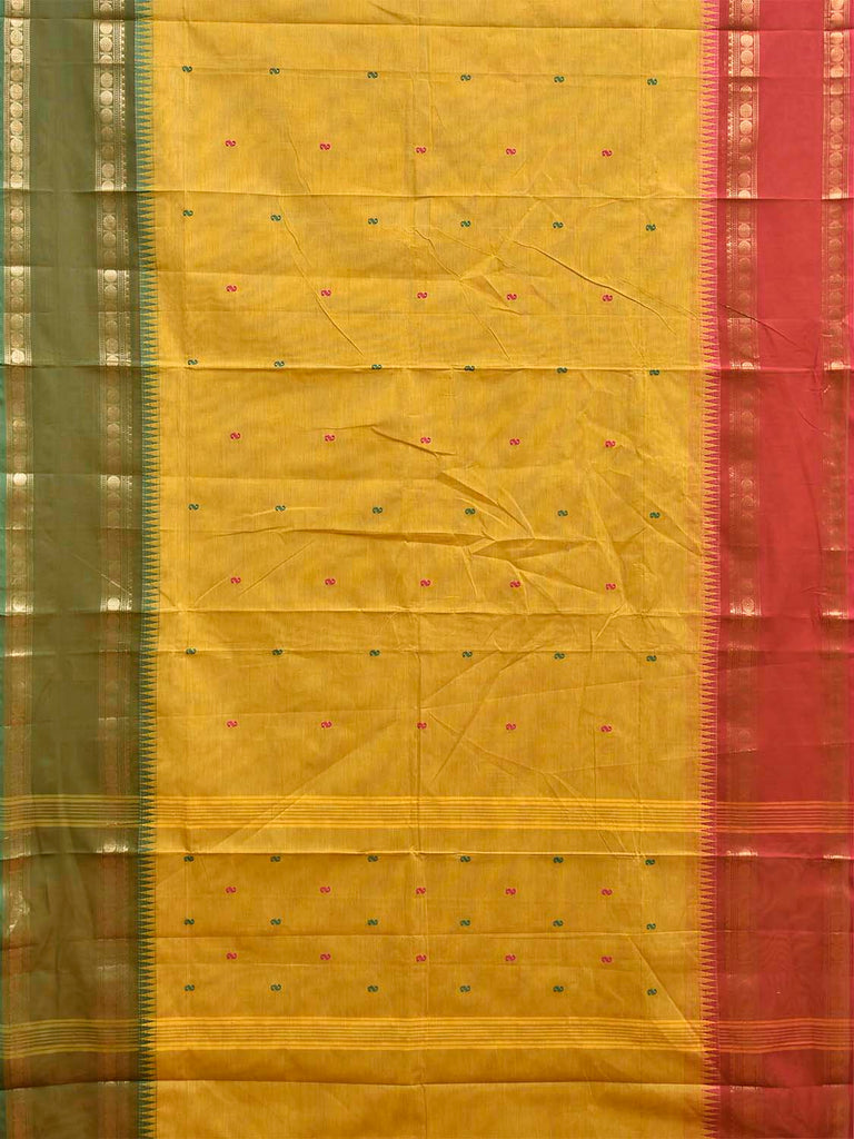 Yellow Kanchipuram Cotton Saree with Ganga-Jamuna Border Design. Traditional Simple South Indian Attire Saree for any Casual Occasions. As it’s a cotton saree we advice gentle handwash separately for fabric care. This saree has no blouse.